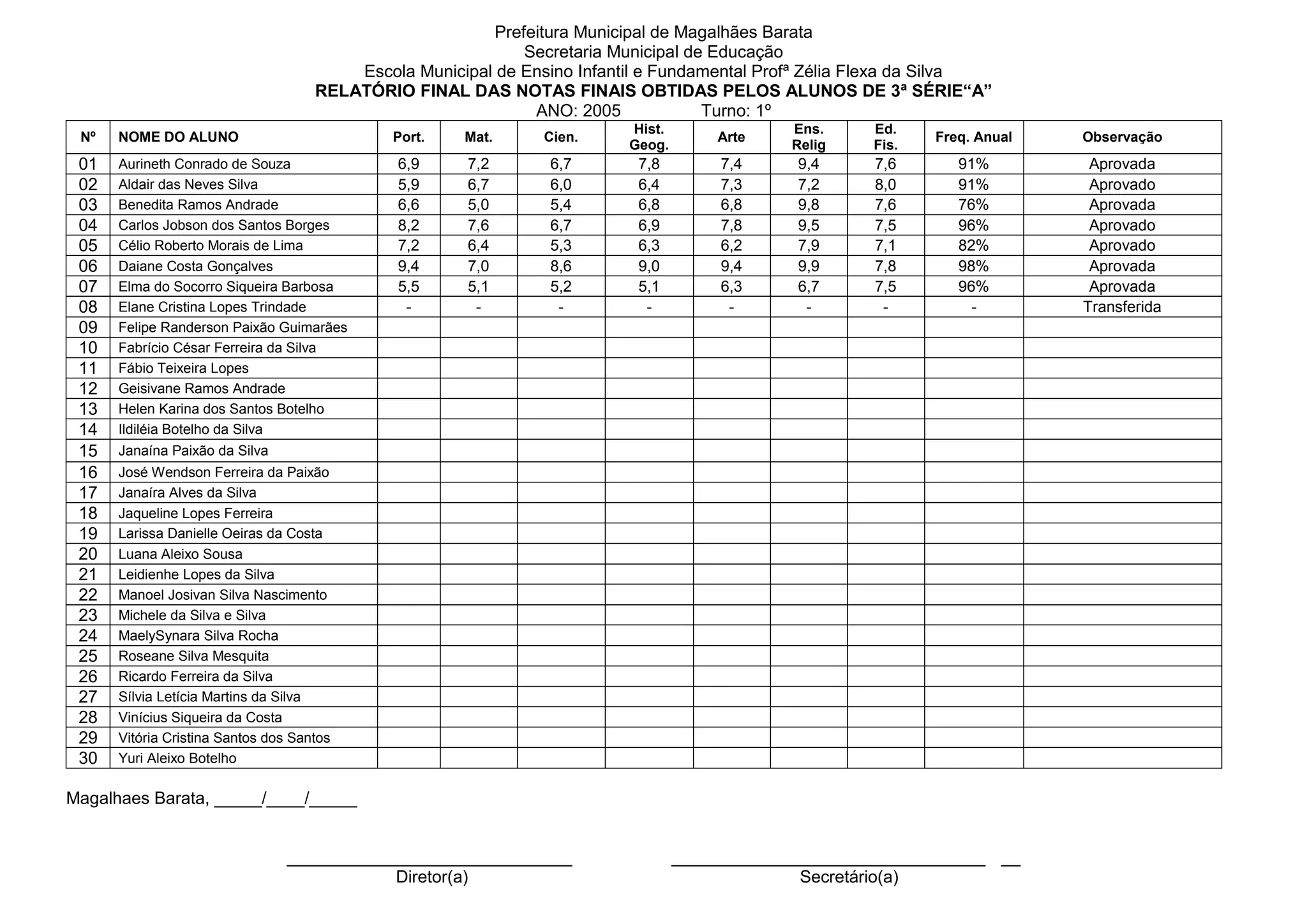 O relatório apresenta as notas finais obtidas pelos alunos da 3a série "A" de uma escola municipal em 2005. As matérias incluem português, matemática, ciências, história, geografia, ensino religioso, educação artística e educação física. A maioria dos alunos foi aprovada, com exceção de alguns que foram transferidos ou reprovados.