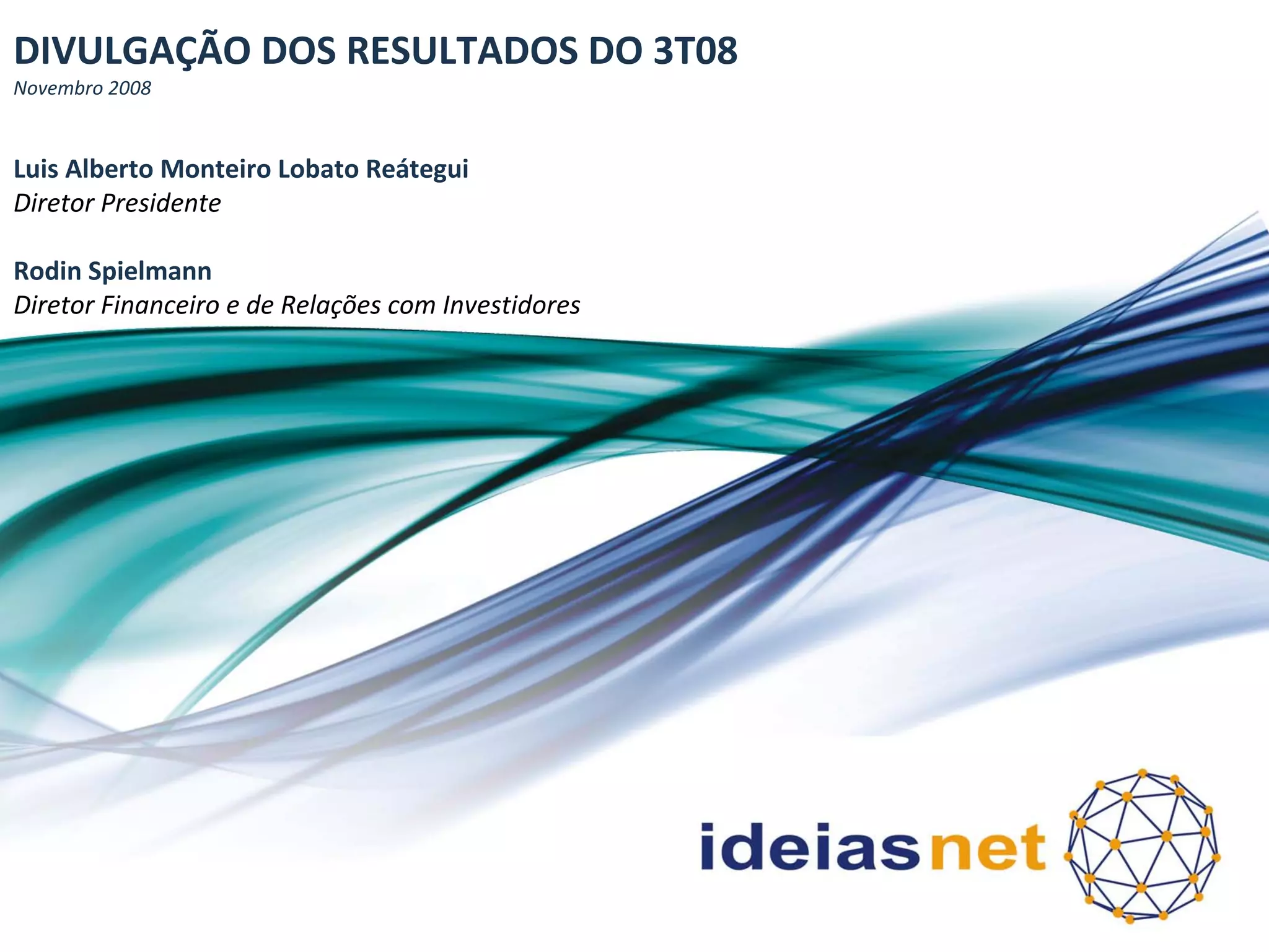 O documento resume os resultados financeiros da Ideiasnet no terceiro trimestre de 2008, destacando um aumento de 17,7% na receita líquida e de 64,6% no EBITDA em comparação com o mesmo período do ano anterior. As principais empresas investidas também apresentaram crescimento nas métricas financeiras. A Ideiasnet encerrou o trimestre sem dívida líquida.