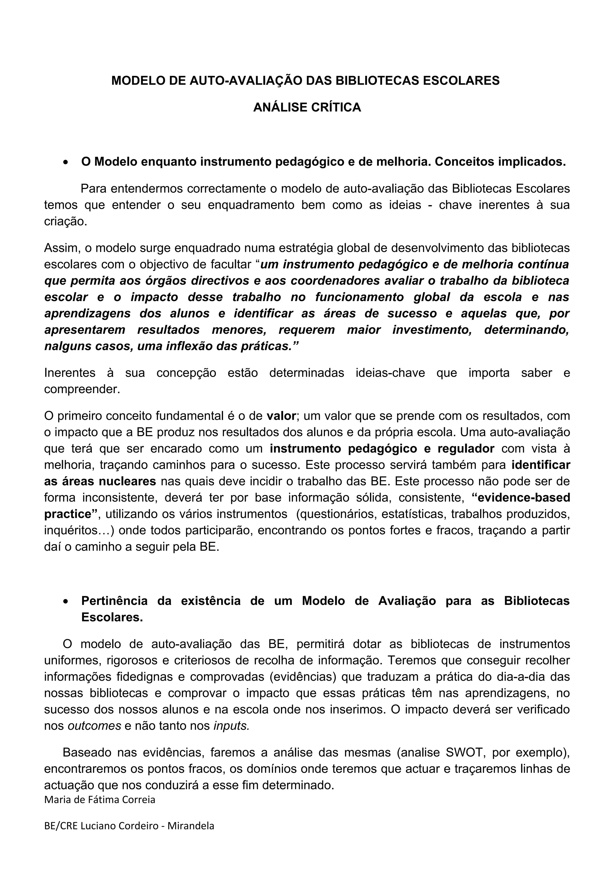 O documento analisa um modelo de auto-avaliação para bibliotecas escolares. Discute como o modelo fornece um instrumento para avaliar o trabalho da biblioteca e seu impacto na escola e nas aprendizagens dos alunos. Também aborda como o modelo pode identificar áreas de sucesso e que precisam de melhoria, e como a aplicação do modelo envolve toda a comunidade escolar.