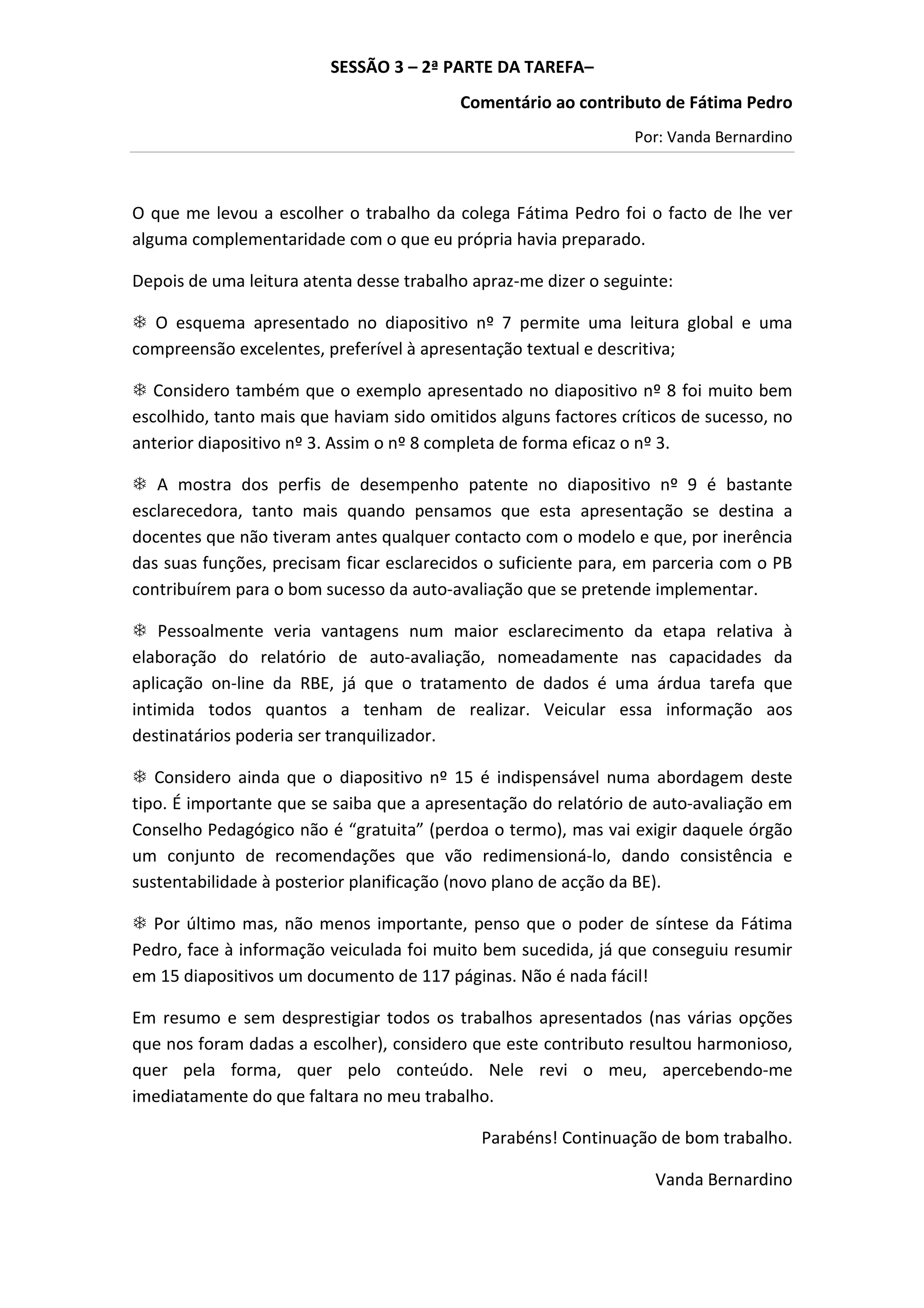 O documento comenta o trabalho da colega Fátima Pedro sobre a autoavaliação de escolas. Elogia a apresentação clara e concisa do esquema e exemplos utilizados, bem como os perfis de desempenho mostrados. Sugere um maior esclarecimento sobre a elaboração de relatórios de autoavaliação. Conclui elogiando o poder de síntese de Fátima Pedro para resumir um documento de 117 páginas em 15 slides.