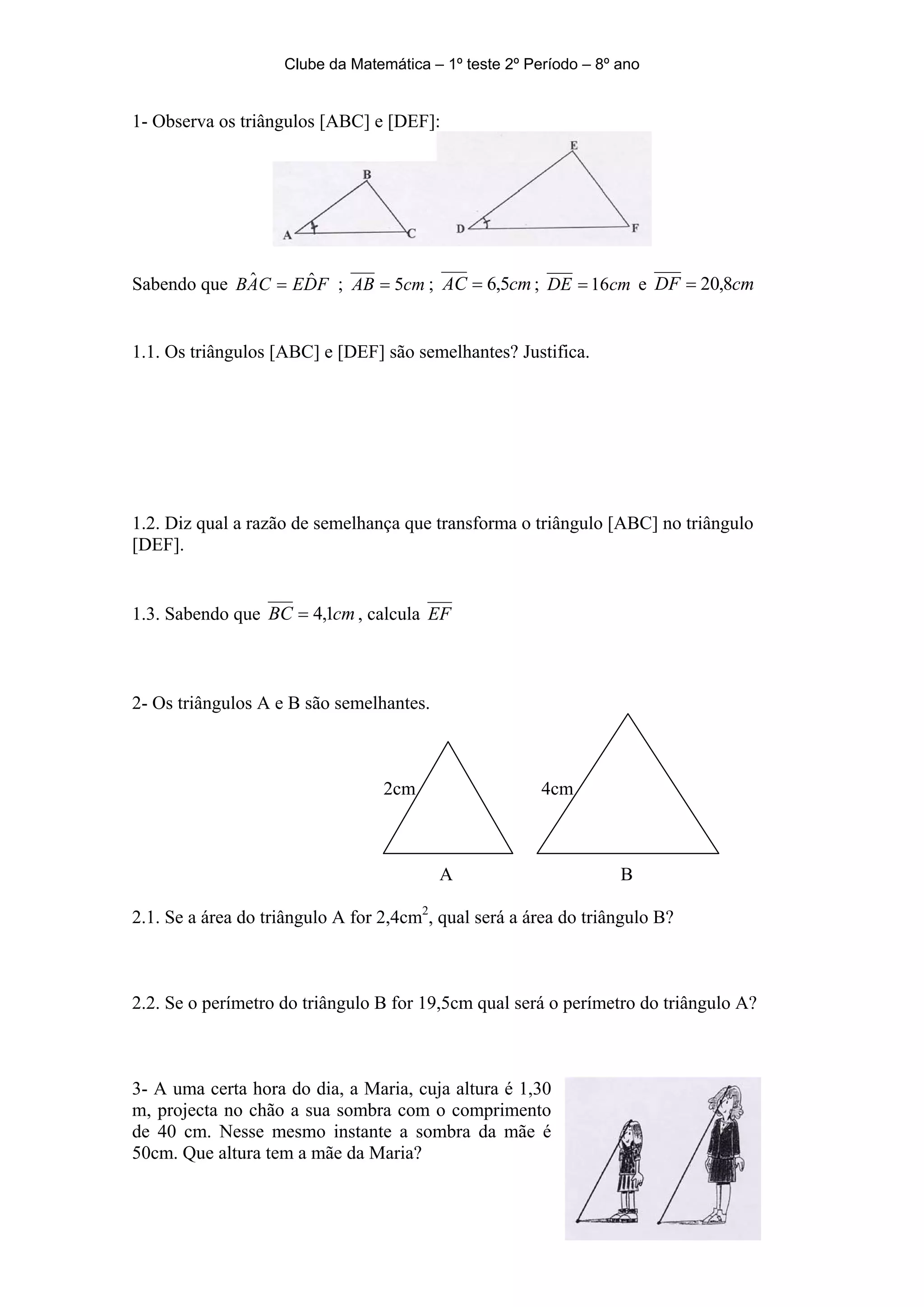 O documento contém 9 questões sobre triângulos semelhantes, funções, geometria espacial e equações. As questões incluem determinar se triângulos são semelhantes, calcular áreas e perímetros, identificar funções, representar funções através de diagramas e tabelas, calcular medidas em um cubo, e resolver equações e problemas algébricos.