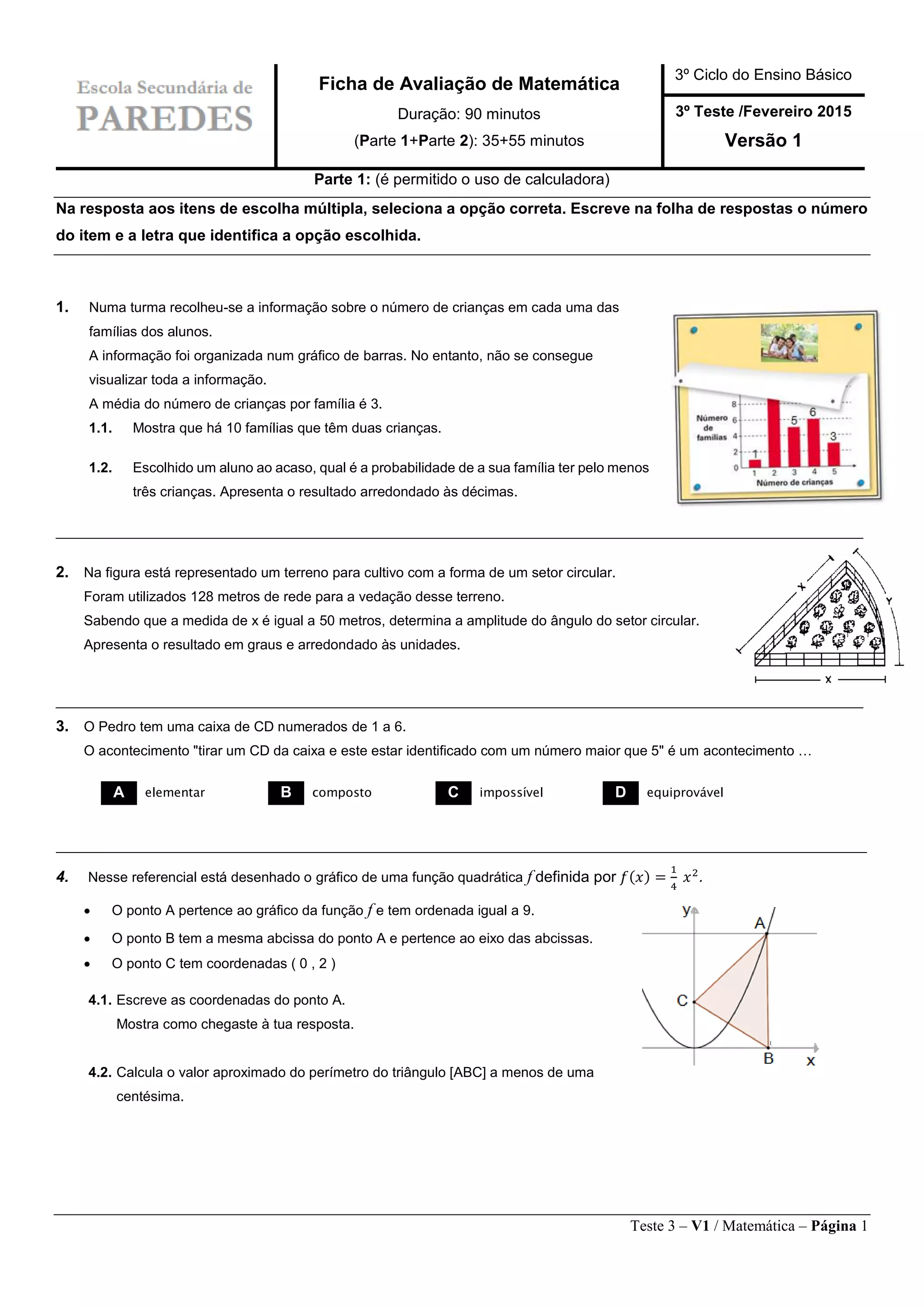 O documento apresenta um teste de matemática com 16 questões divididas em duas partes. A primeira parte permite o uso de calculadora e contém questões de escolha múltipla e cálculos. A segunda parte não permite o uso de calculadora e também contém questões de escolha múltipla e resolução de exercícios algébricos e geométricos.