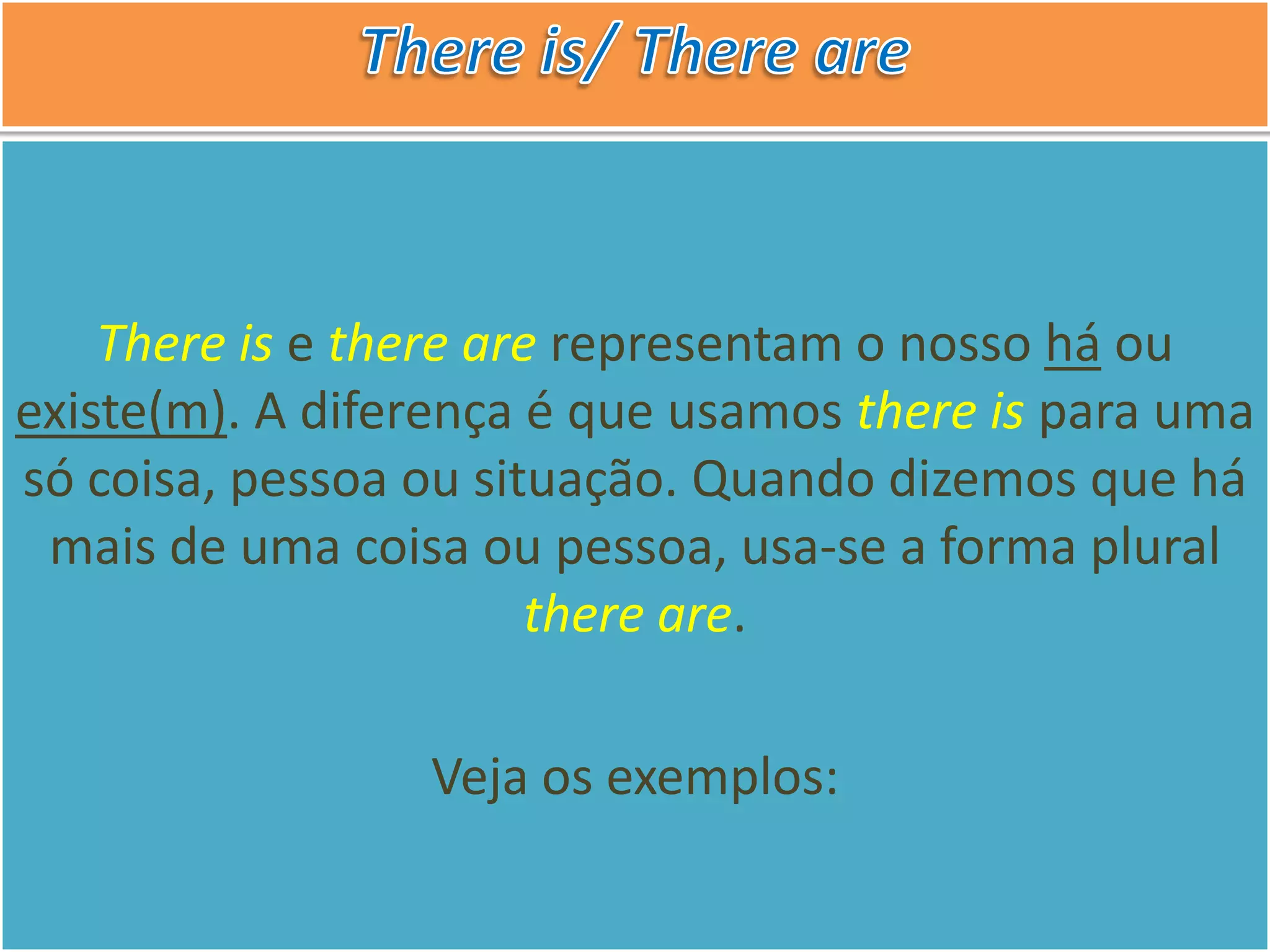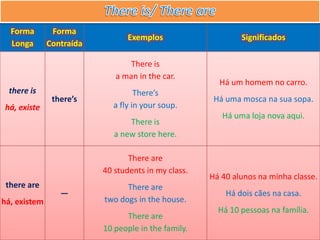 Este documento explica a diferença entre "there is" e "there are" em inglês. "There is" é usado para uma única coisa ou pessoa, enquanto "there are" é usado no plural para mais de uma coisa ou pessoa. Exemplos são fornecidos para ilustrar corretamente quando usar "there is" e "there are" em frases afirmativas e negativas.