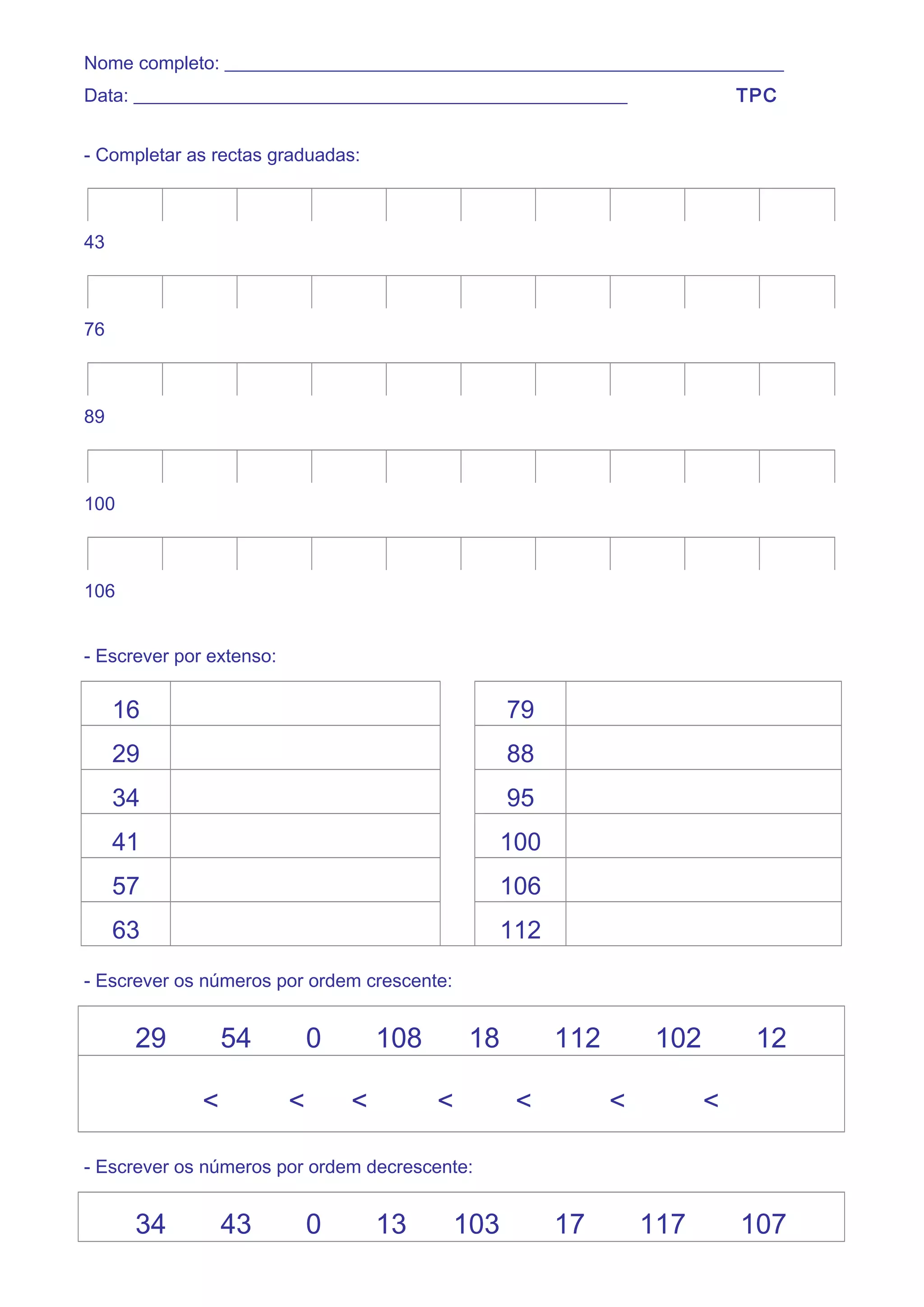 Este documento contém várias tarefas matemáticas, incluindo completar retas graduadas com números, escrever números por extenso, ordenar números em ordem crescente e decrescente, e calcular expressões aritméticas.