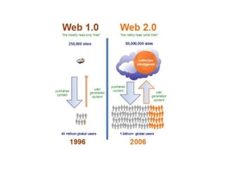 O documento discute a blogosfera e a Web 2.0. Resume que a blogosfera tem mais de 180 milhões de blogs sendo criados 100 mil por dia, com 1.3 milhões de mensagens diárias. Também resume os principais conceitos da Web 2.0 como sites dinâmicos, aplicações na nuvem, feedback dos usuários e democratização da web.