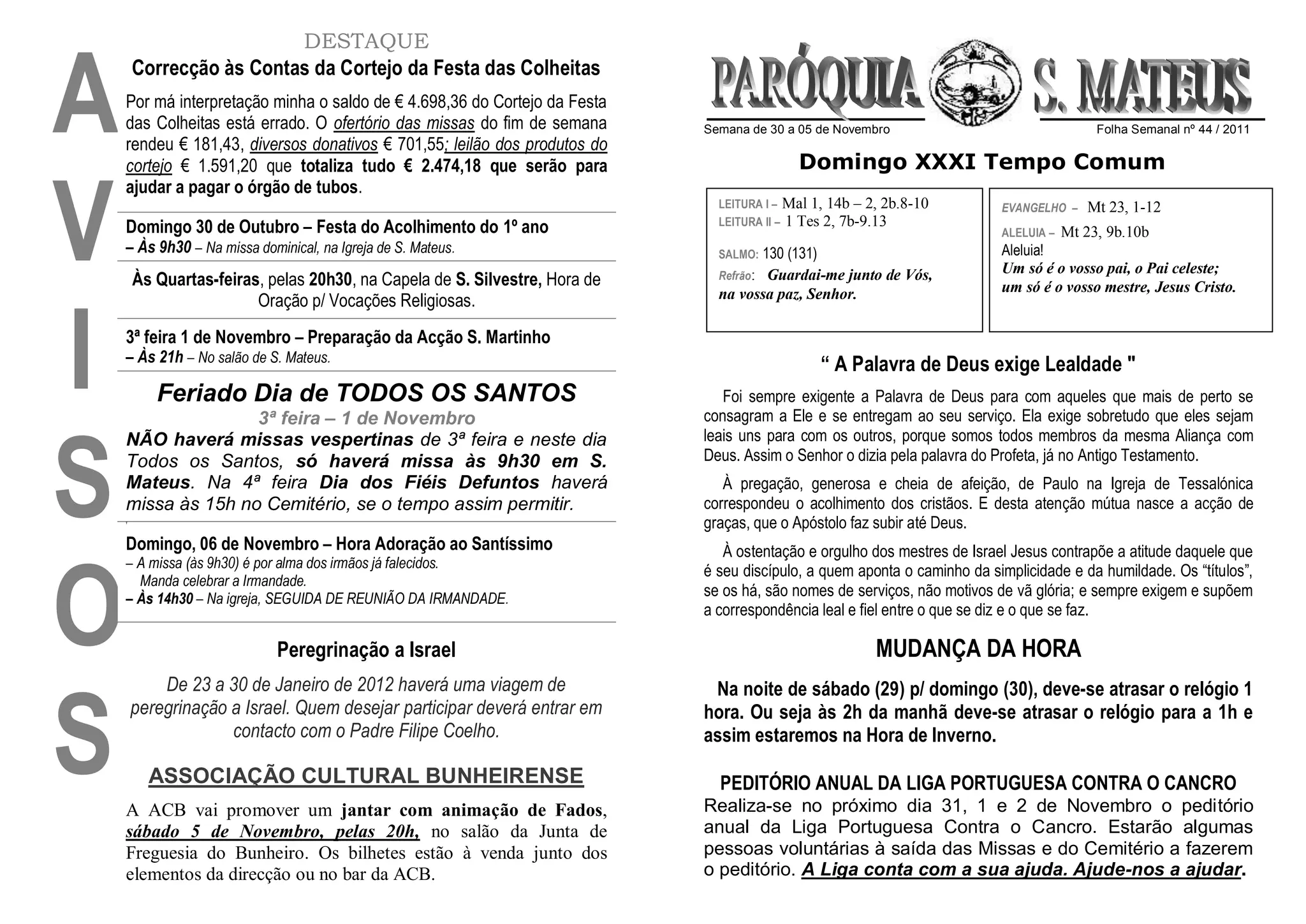 Este documento é um boletim semanal de uma igreja que fornece informações sobre eventos e serviços religiosos planejados para a semana. Ele corrige um saldo financeiro de um evento anterior, anuncia missas e orações programadas, e discute brevemente uma passagem bíblica sobre lealdade à palavra de Deus.