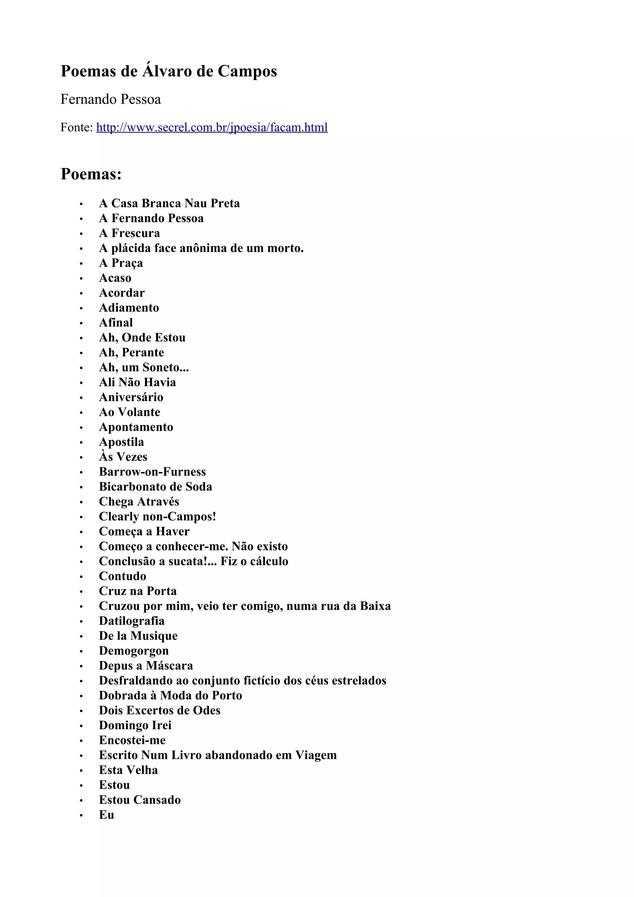 Este documento apresenta uma coleção de poemas escritos por Álvaro de Campos, um heterônimo de Fernando Pessoa. Inclui uma nota preliminar do próprio Pessoa comentando sobre a poesia de Campos e fazendo distinções entre poesia e prosa. A coleção contém mais de 50 poemas de Campos sobre temas como sonhos, viagens, paisagens e estados mentais.