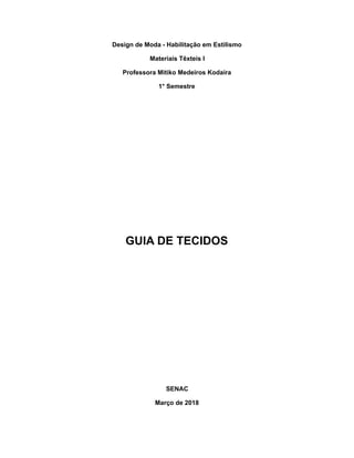 O documento descreve diferentes tipos de tecidos, suas características e usos. Aborda tecidos planos como brim, cambraia, cetim e chambray, além de padronagens como xadrez. Também discute tecidos de malha e especiais. Fornece detalhes históricos e aplicações de cada material.