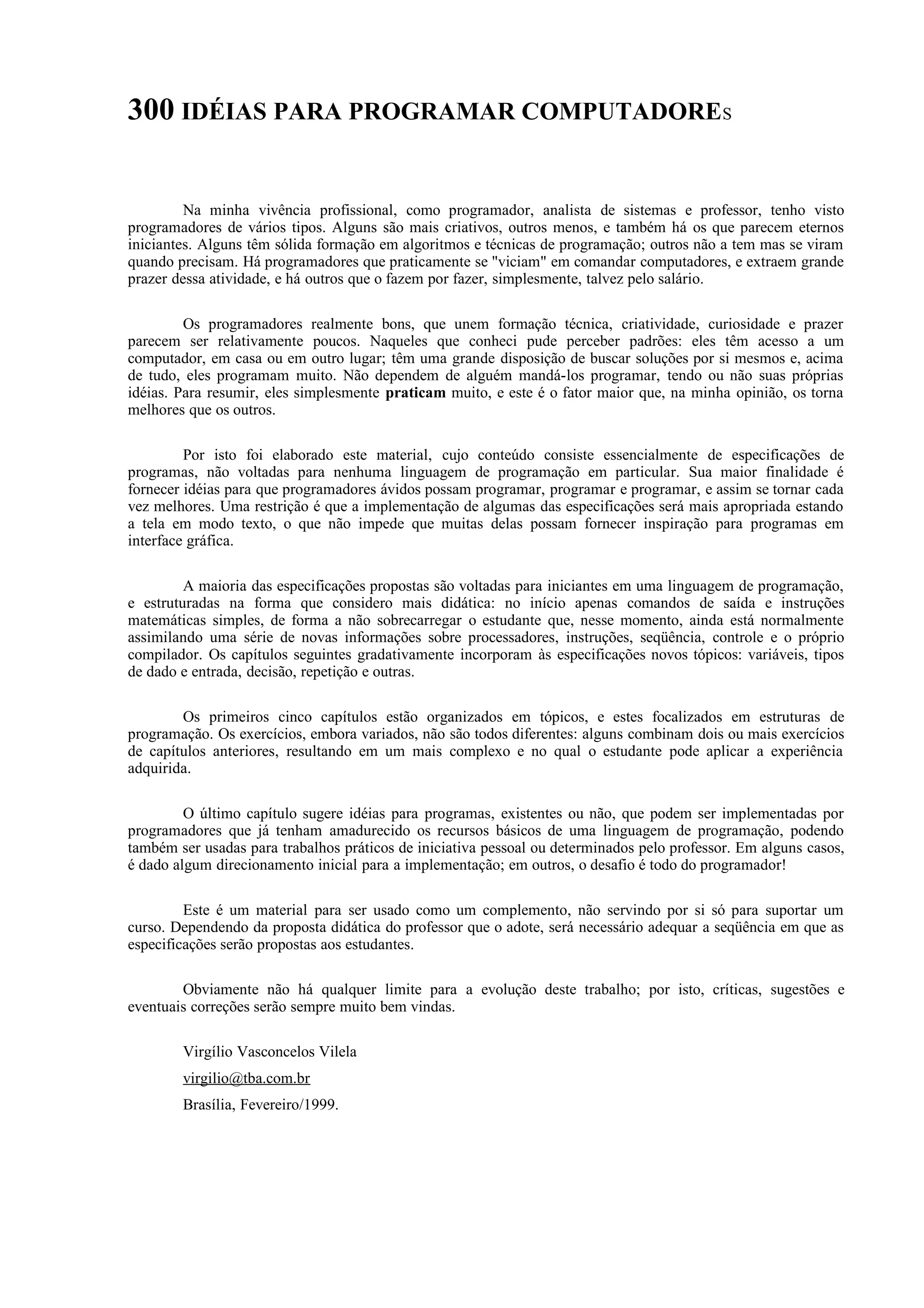 1. O documento apresenta 300 ideias de programas para iniciantes em programação, organizadas em capítulos focados em tópicos como saída simples, matemática, variáveis, decisão e repetição.