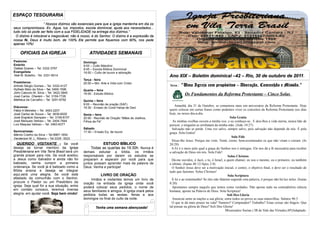 O documento discute a importância dos dízimos para manter as atividades da igreja como água, luz e ajuda aos necessitados. Também lista as atividades semanais da igreja incluindo cultos, estudos bíblicos e ensaios musicais. Finalmente, convida visitantes a se tornarem membros da igreja e participarem das atividades.