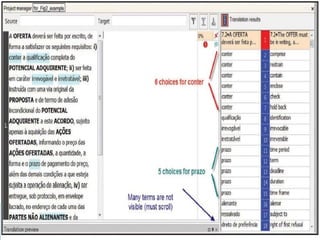 O documento discute estratégias para gestão de terminologia e glossários por tradutores. Apresenta diversos formatos para armazenamento de dados terminológicos, como planilhas, textos e ferramentas de CAT. Também discute a importância de distinguir terminologia própria de terminologia importada e validá-la.
