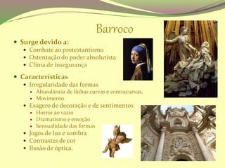 O documento descreve o estilo artístico barroco, que emergiu no final do século XVI até meados do século XVIII, caracterizando-se pela exuberância, irregularidade das formas e intensa emotividade em arquitetura, escultura e pintura. Enfatiza a influência do absolutismo e da contra-reforma, abordando importantes artistas e obras na Europa e em Portugal, como Bernini e Rubens. Também destaca as características essenciais do barroco, incluindo o uso de luz e sombra, movimento e realismo nas expressões.