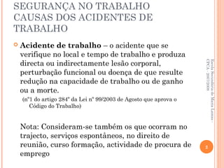 - O documento discute as causas dos acidentes de trabalho, classificando-os de acordo com consequências, forma, agente material, natureza da lesão e localização da lesão.