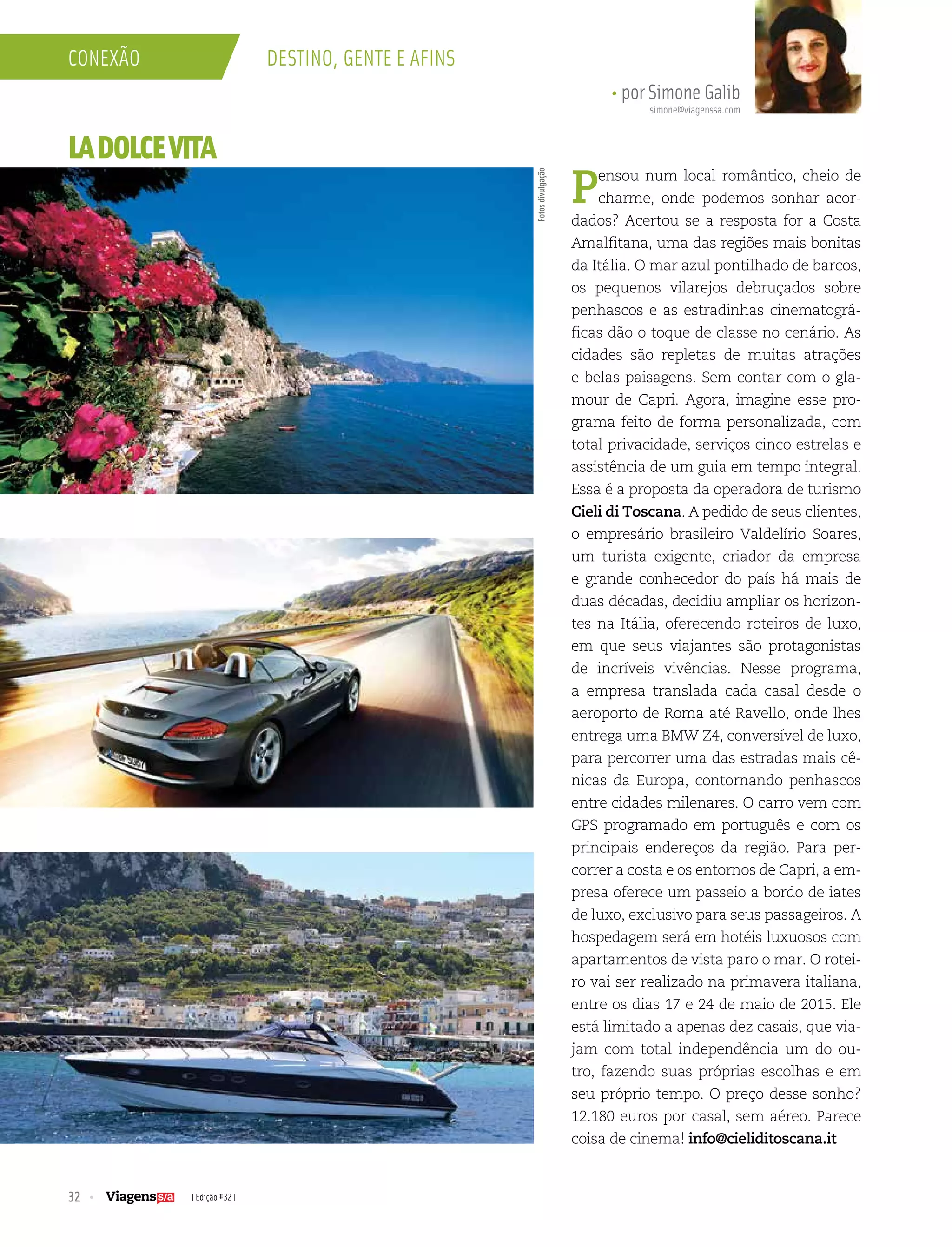 O documento discute várias opções de viagem na Itália e em outros países. Ele oferece um roteiro de luxo na Costa Amalfitana com carro de luxo, iate e hotéis de luxo. Também menciona um salão de beleza em um hospital em São Paulo e resorts sustentáveis no Brasil e na Tailândia. Além disso, discute o uso do Facebook para planejar, compartilhar e lembrar de viagens.