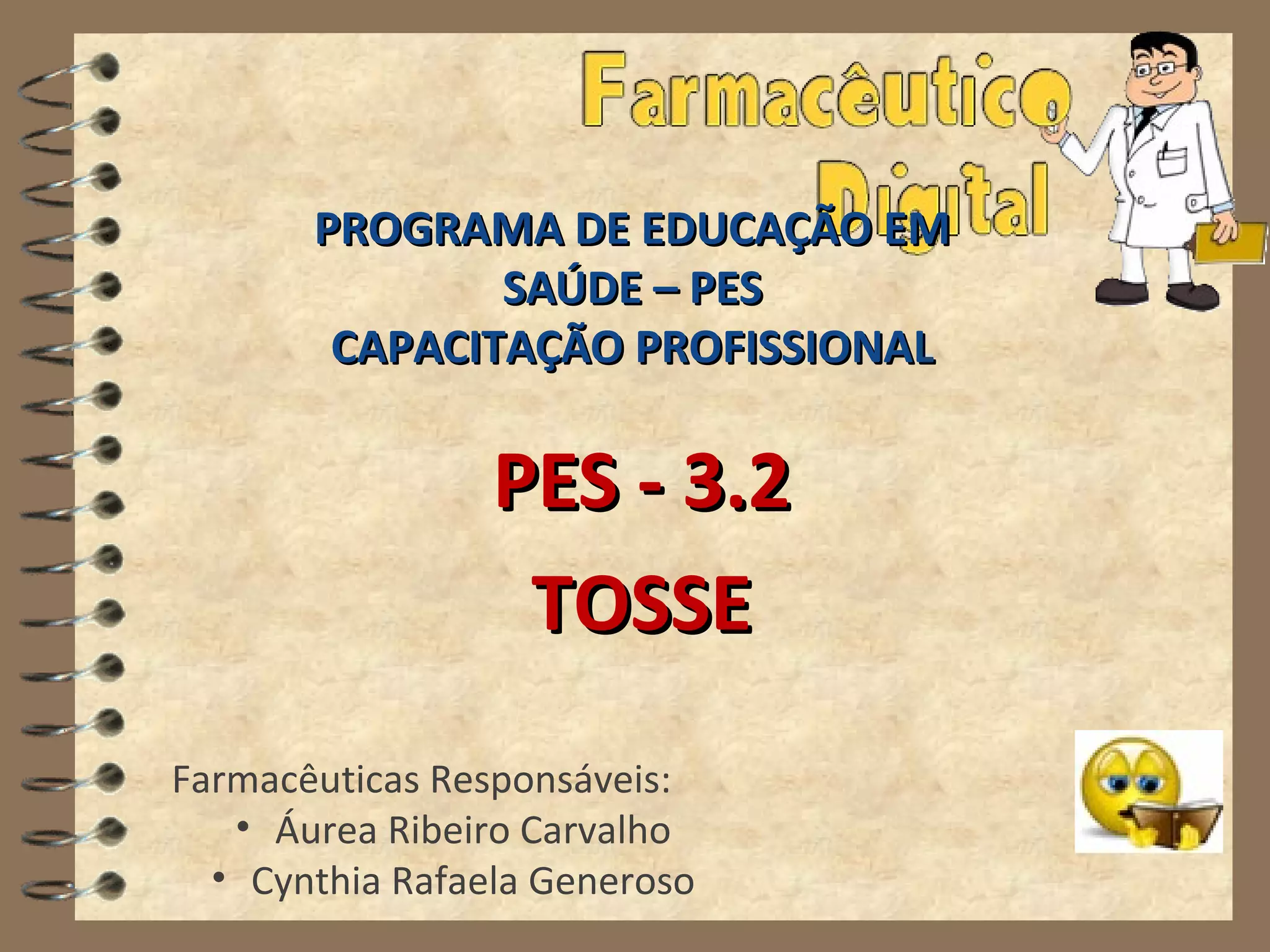 Este documento fornece informações sobre tosse, incluindo suas causas, tipos, mecanismos e tratamentos. É descrito que a tosse é um reflexo desencadeado por estímulos nas vias respiratórias que serve para expelir corpos estranhos. Dois tipos principais são descritos: tosse seca e tosse produtiva, e várias causas como refluxo, fumar e medicamentos são explicadas. O tratamento inclui antitussígenos para tosse seca e expectorantes ou mucolíticos para tosse produt