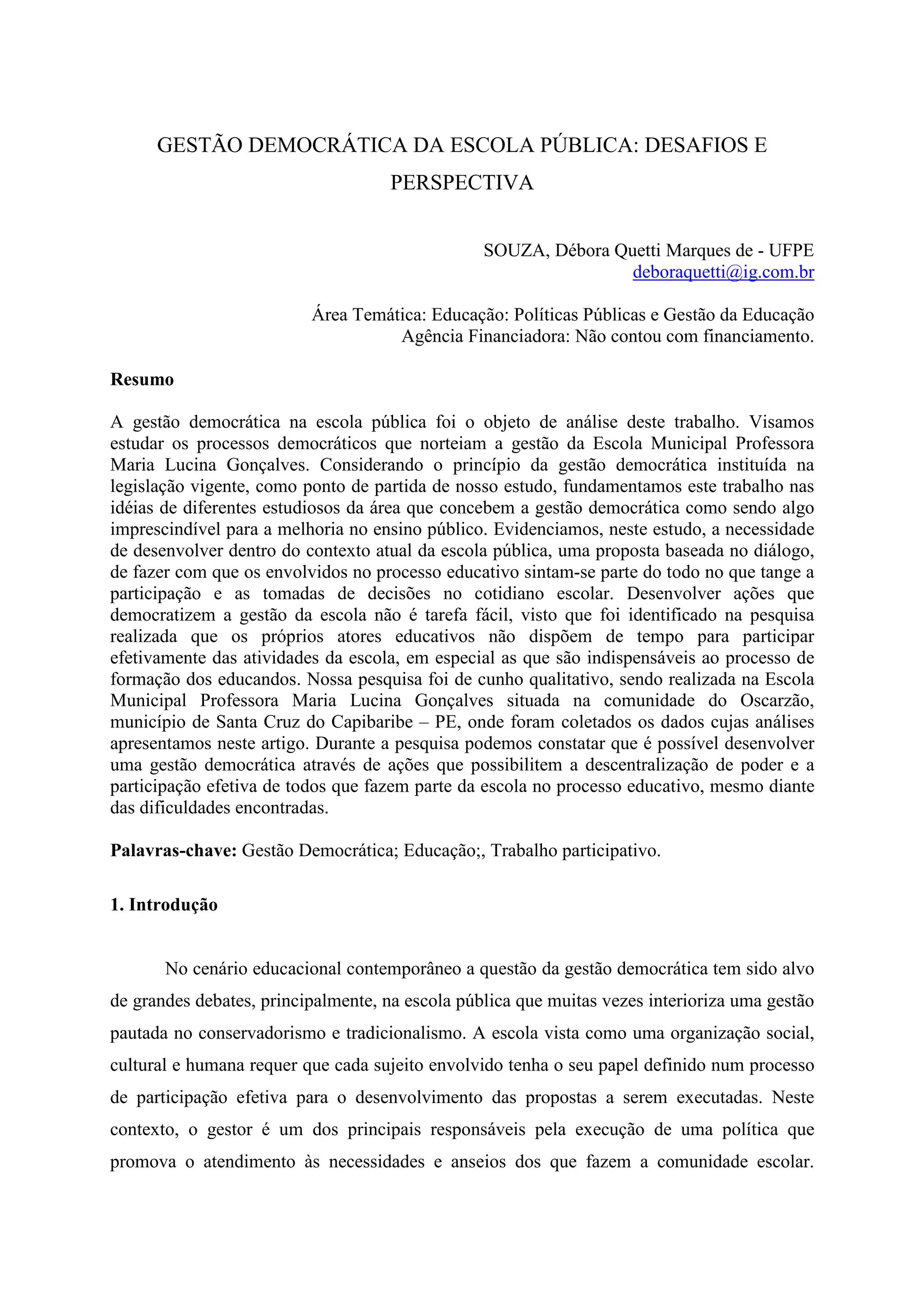 Este documento discute os desafios da gestão democrática na escola pública brasileira. Apresenta a justificativa para a importância da gestão democrática e sua fundamentação teórica segundo autores da área. Também descreve a metodologia e objetivos da pesquisa realizada em uma escola municipal de Pernambuco para analisar como promover uma gestão mais participativa.