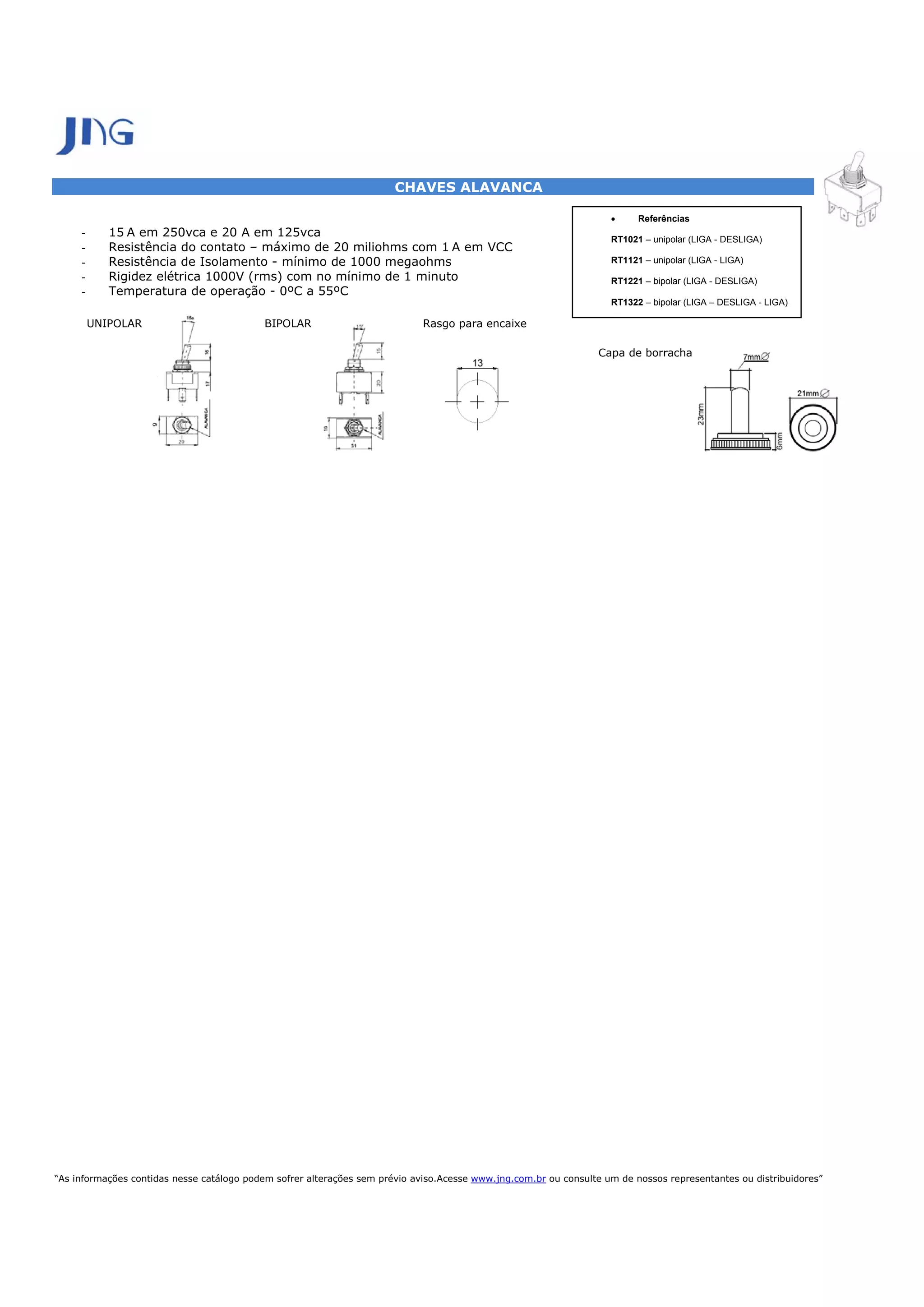 Este documento fornece especificações técnicas de chaves alavancas, incluindo: corrente máxima de 15A/20A, resistência do contato de no máximo 20 miliohms, resistência de isolamento mínima de 1000 megaohms, e temperatura de operação entre 0°C a 55°C. Ele também descreve os tipos de chaves alavancas unipolar e bipolar e suas funções.