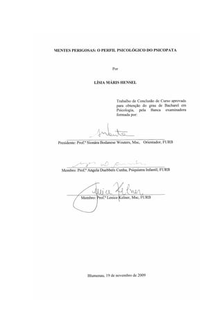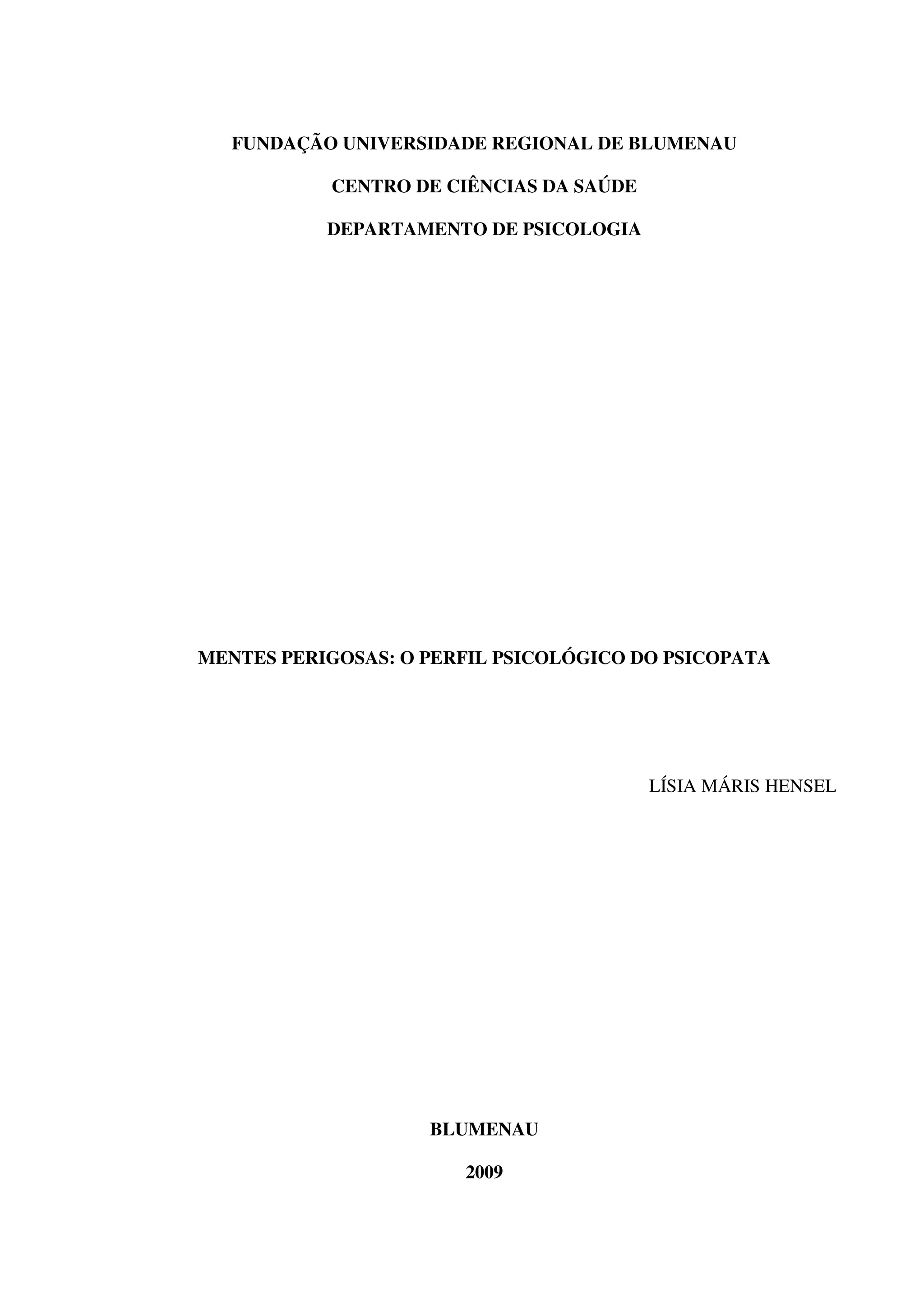 Este trabalho tem como objetivo encontrar o perfil psicológico do psicopata. Realizou uma revisão da literatura sobre criminologia, perfil criminal e psicologia do crime. A pesquisa foi realizada em uma prisão e centro de penas alternativas, aplicando questionários e técnicas projetivas. Os resultados encontrados estão de acordo com a literatura, destacando a dificuldade de psicopatas participarem de pesquisas. A pesquisa contribui ao mostrar que centros de penas alternativas podem ser uma forma de acesso a esse perfil psicol