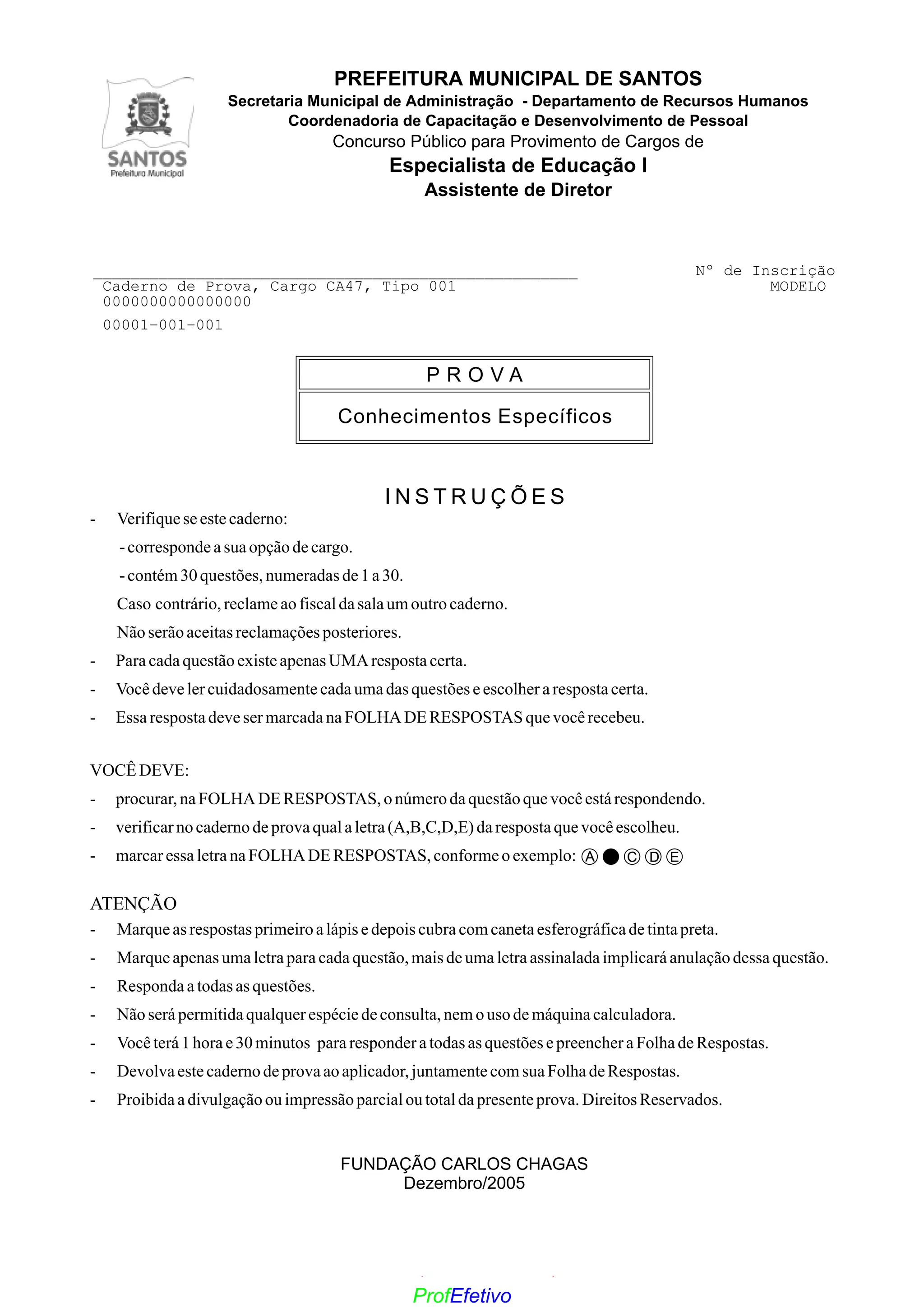 I. O documento apresenta instruções para a realização de uma prova de conhecimentos específicos para os cargos de Assistente de Diretor e Especialista de Educação I da Prefeitura Municipal de Santos.