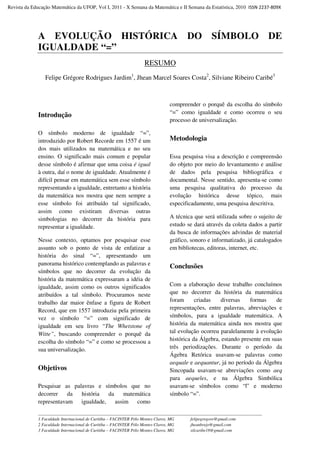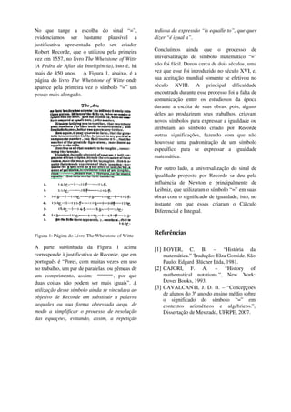 O documento descreve a evolução histórica do símbolo de igualdade "=". Foi introduzido por Robert Recorde em 1557 para substituir expressões verbais como "é igual a". Levou cerca de dois séculos para ser universalizado, devido à falta de comunicação entre estudiosos da época. O símbolo só se popularizou no século XVIII com o trabalho de Newton e Leibniz no cálculo.
