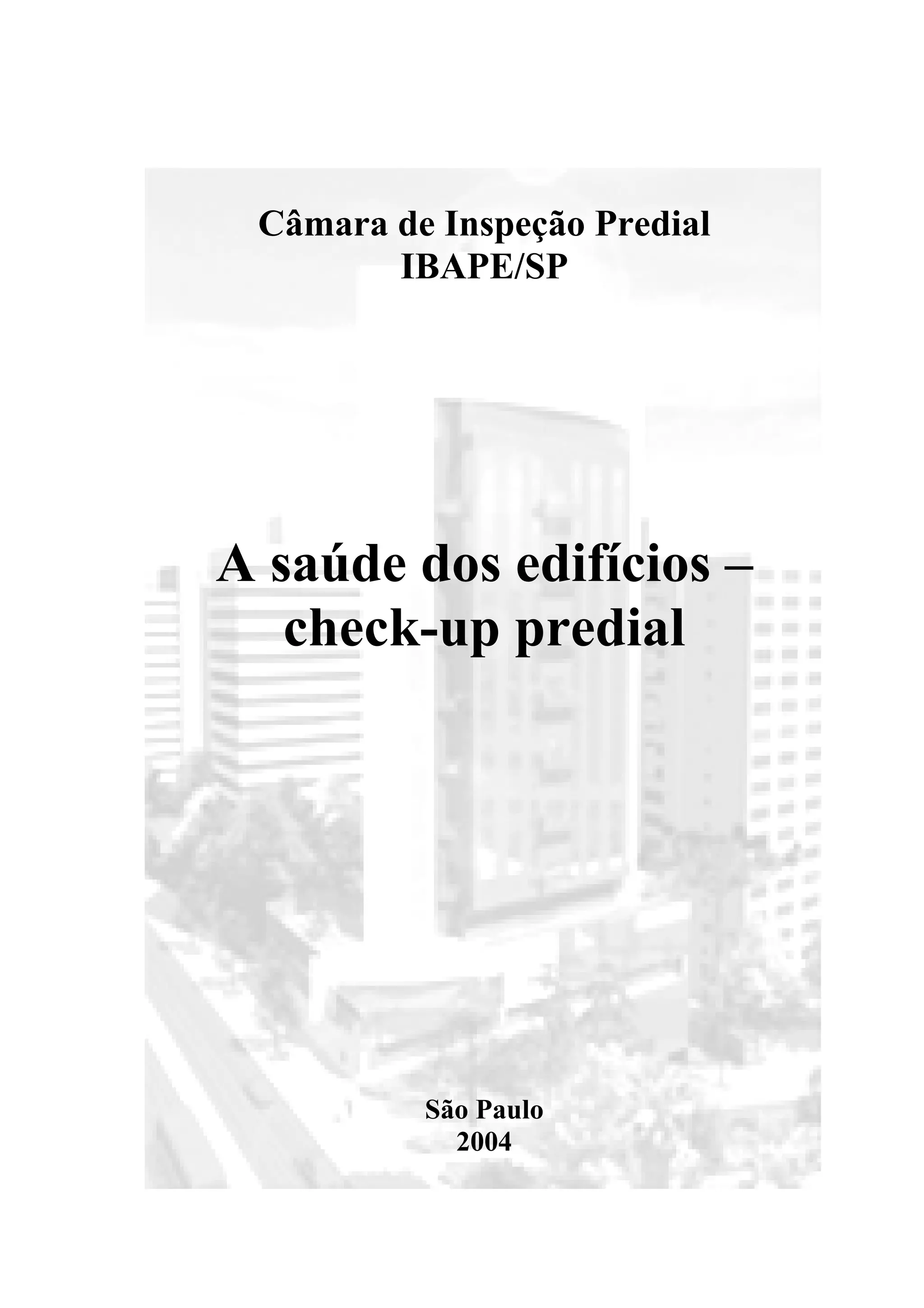 O documento discute os perigos de anomalias construtivas e a importância da inspeção predial e manutenção para garantir a segurança e saúde dos edifícios. É destacada a responsabilidade dos proprietários e síndicos na manutenção para evitar danos decorrentes de fatores funcionais como desgaste e falta de conservação. O documento também fornece orientações técnicas sobre os principais sistemas prediais e como realizar a manutenção preventiva.