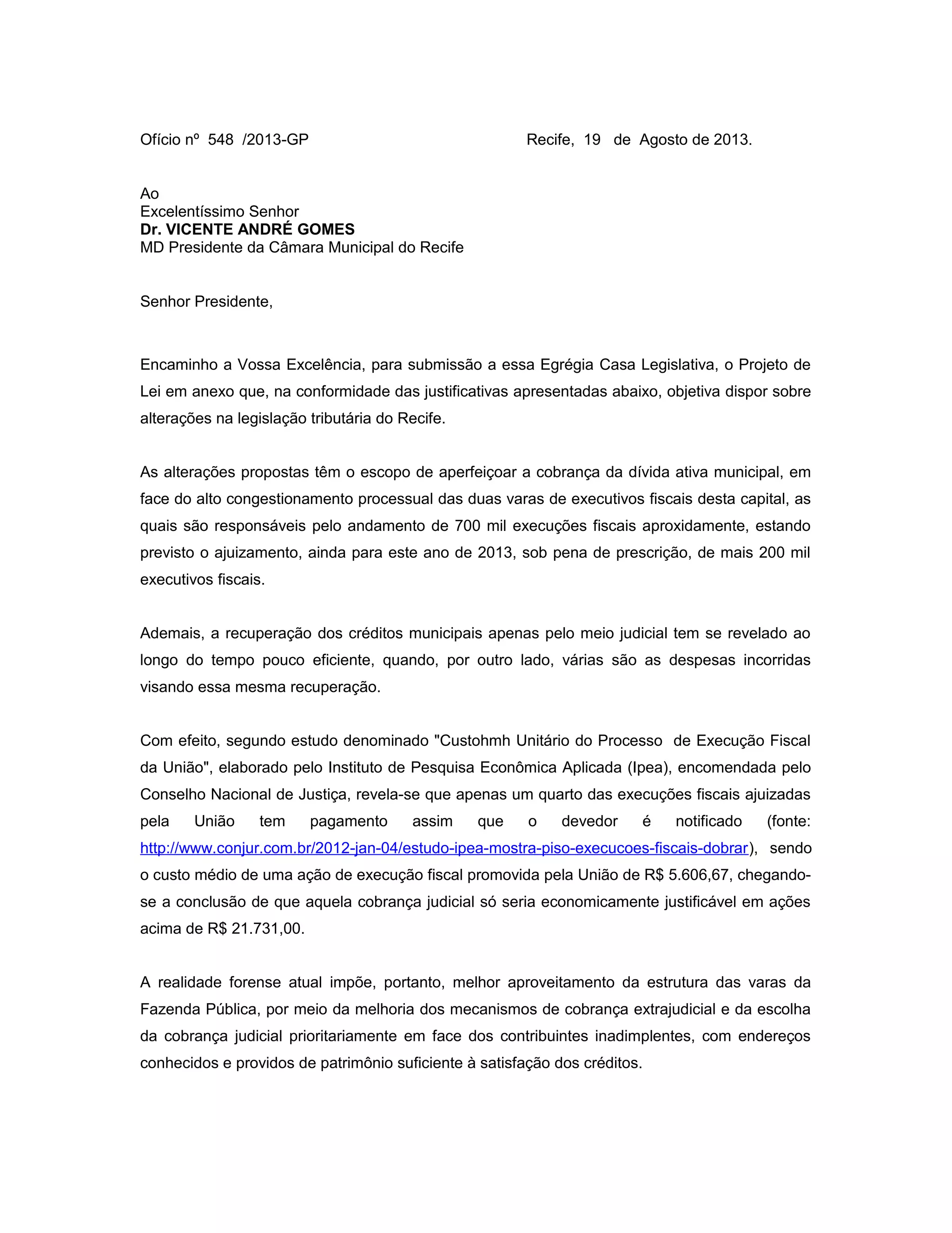 O documento propõe alterações na legislação tributária do Recife para aperfeiçoar a cobrança da dívida ativa municipal, diante do alto congestionamento das varas de execução fiscal. As alterações incluem autorizar o protesto extrajudicial de dívidas tributárias e não tributárias e reduzir em 10% a taxa cobrada em caso de pagamento após protesto, antes de execução judicial. Também autoriza desistir de ações de execução fiscal de valores baixos.