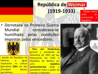 O documento descreve a ascensão do Partido Nazista na República de Weimar entre 1919-1933, quando assumiu o poder. Detalha a crise econômica e política que abalou a Alemanha após a Primeira Guerra, o crescimento eleitoral dos nazistas explorando o nacionalismo e a instabilidade. Em 1933, Hitler foi nomeado chanceler e estabeleceu um regime totalitário, banindo outros partidos e iniciando a perseguição de judeus e opositores.
