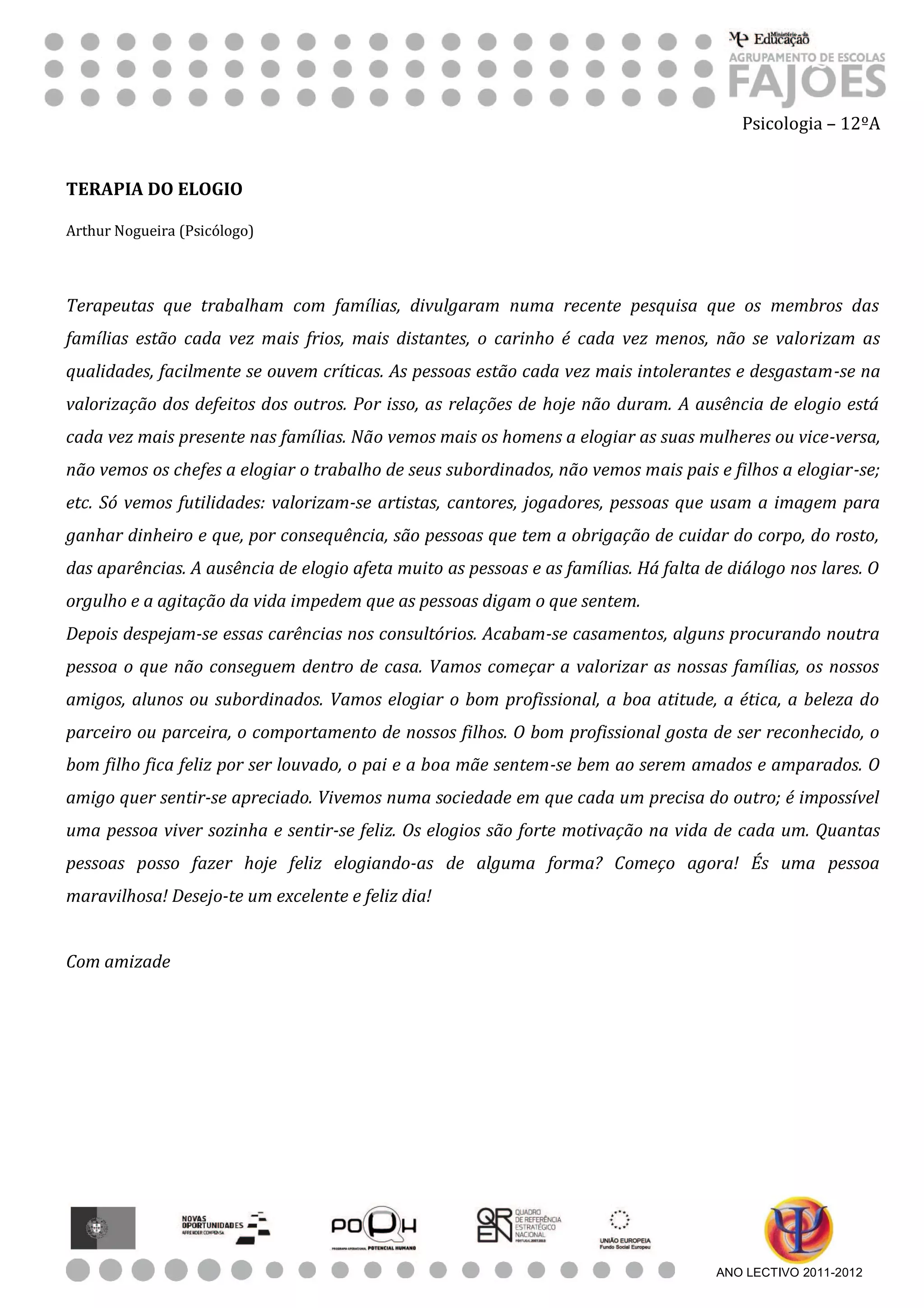 Pesquisas mostram que as famílias estão mais frias e distantes, com menos carinho e elogios. Isso afeta negativamente as relações e aumenta a intolerância. A terapia do elogio propõe valorizar as qualidades dos outros através de elogios, para fortalecer laços familiares e motivar as pessoas. Elogiar o trabalho e comportamento de outros pode fazer com que se sintam apreciados e felizes.