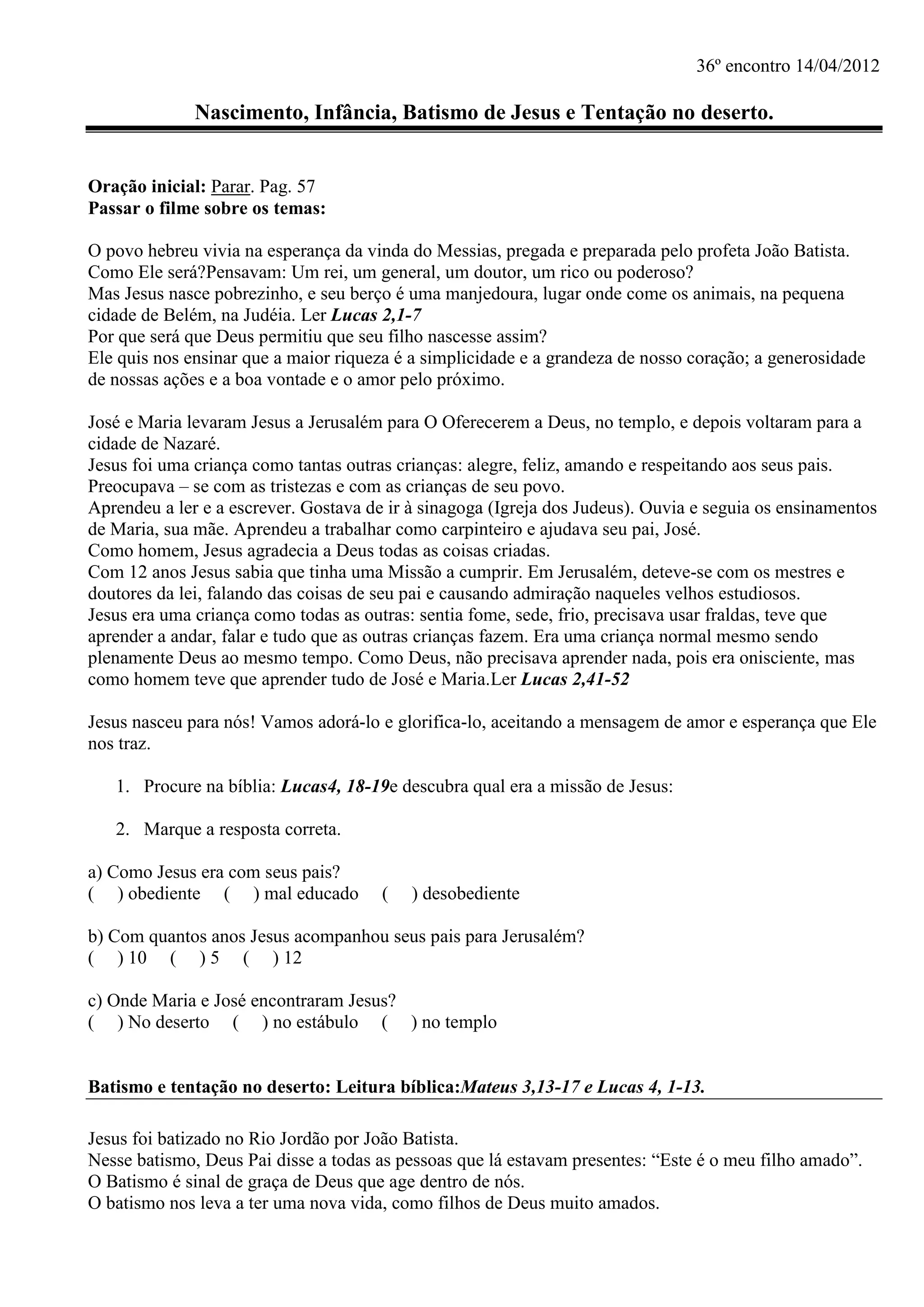 1) O documento descreve o nascimento, infância, batismo e tentação no deserto de Jesus.