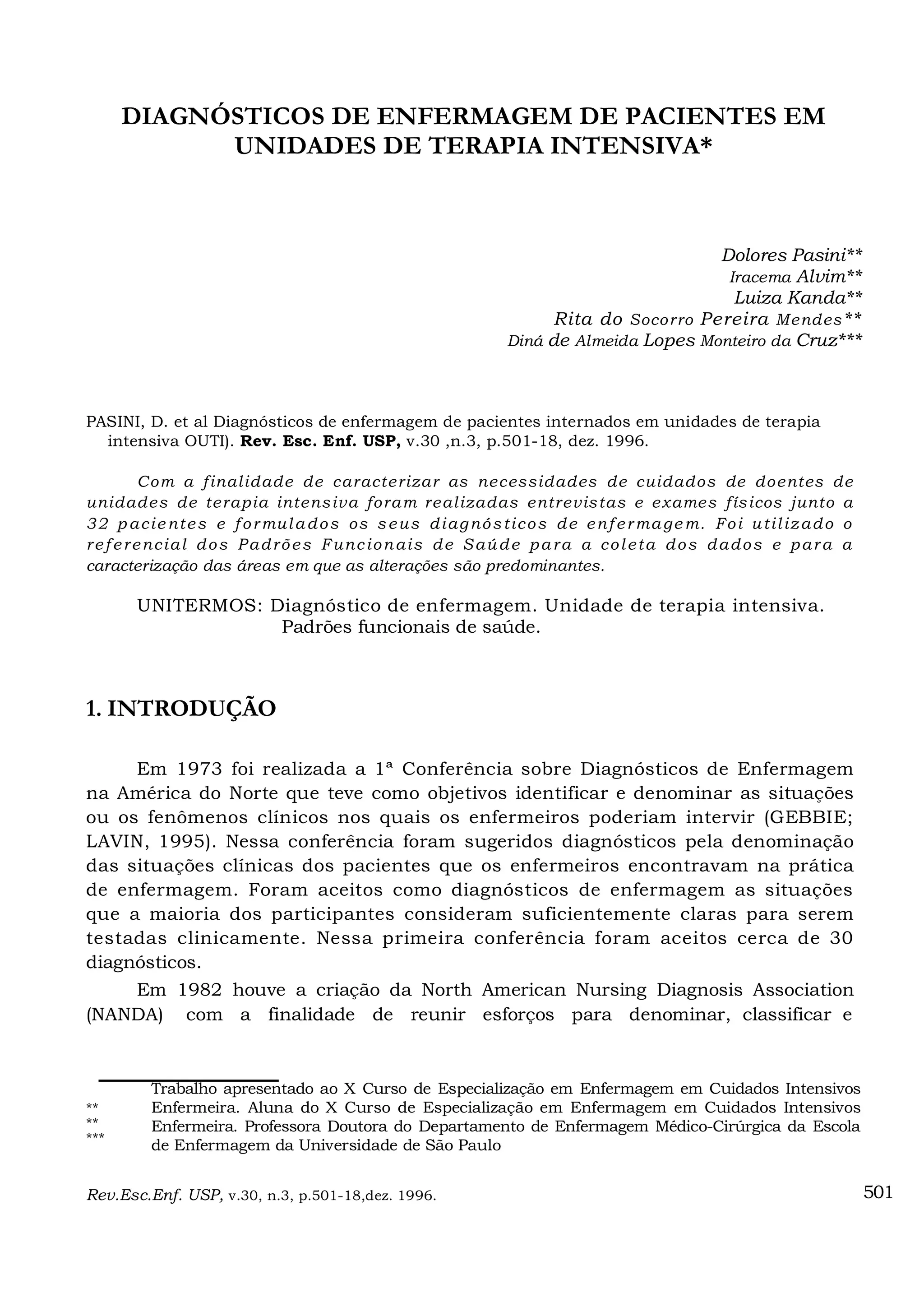 Este documento descreve um estudo realizado para caracterizar os diagnósticos de enfermagem de 32 pacientes internados em unidades de terapia intensiva utilizando os Padrões Funcionais de Saúde. Os diagnósticos mais comuns foram alto risco para infecção, integridade da pele prejudicada e mobilidade física prejudicada. O estudo visa identificar as principais necessidades de cuidados de enfermagem desses pacientes.