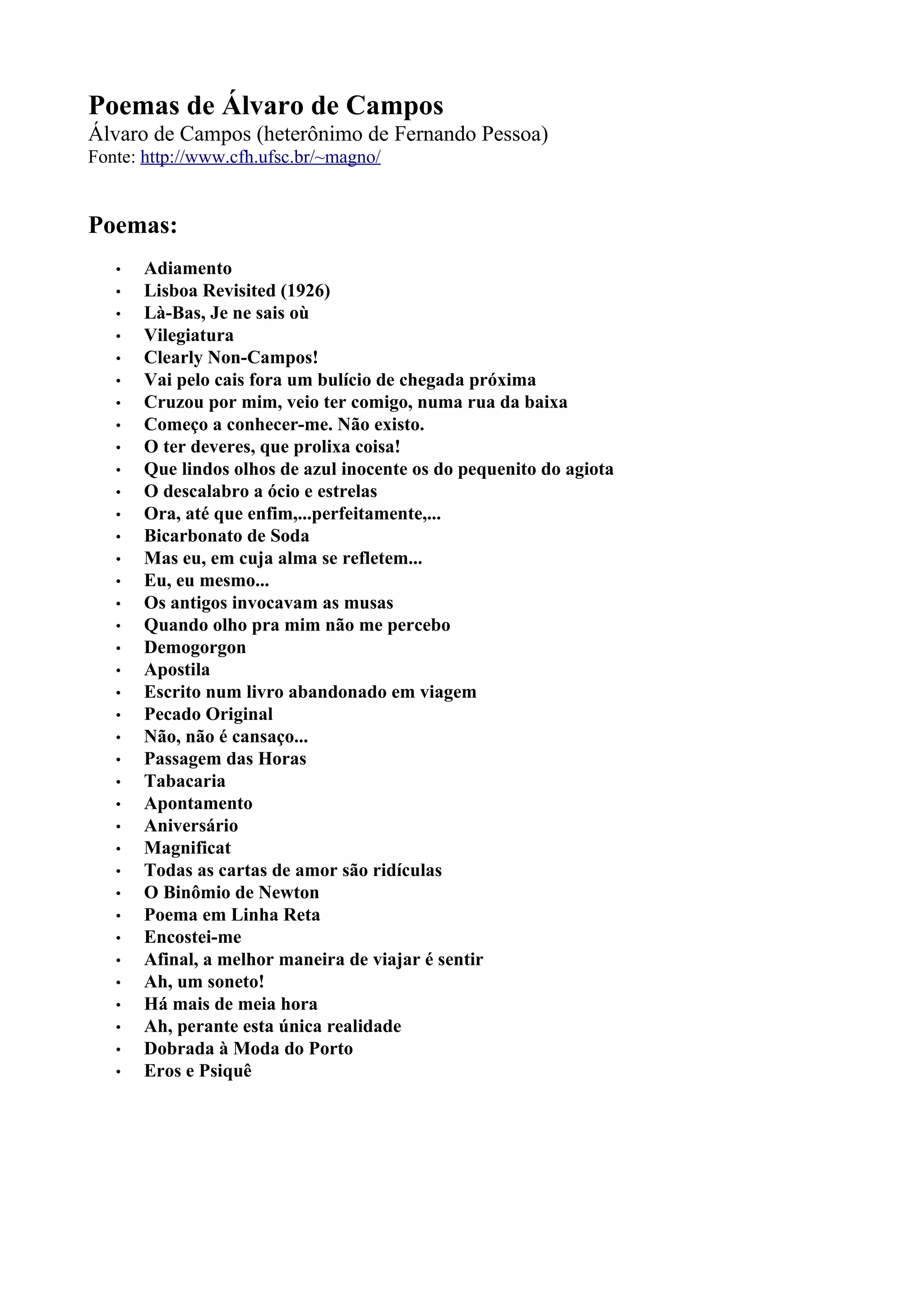 O documento lista vários poemas do heterônimo de Fernando Pessoa, Álvaro de Campos. Os poemas abordam temas como adiamento, viagens, solidão e cansaço existencial.