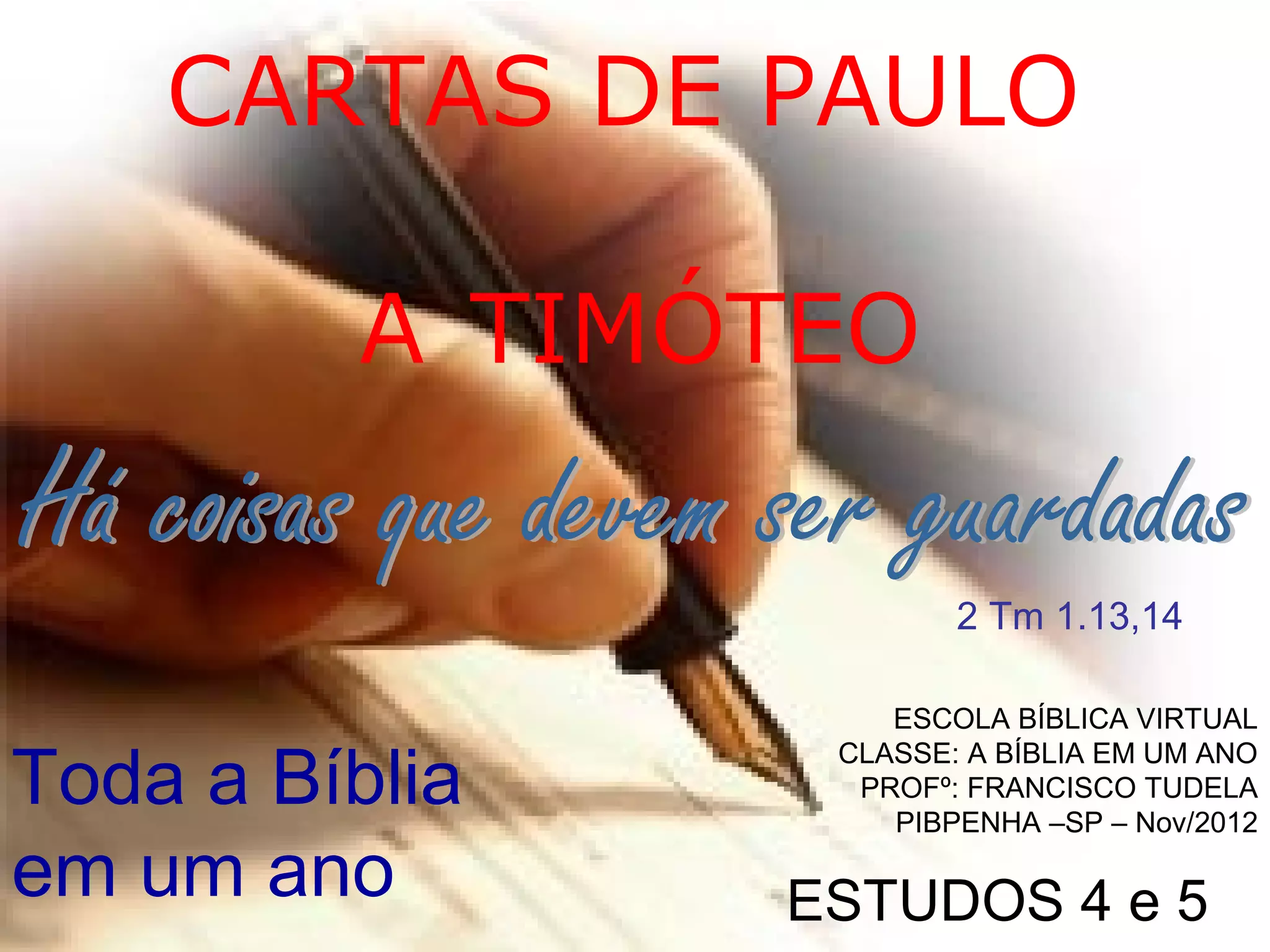 Este documento resume as cartas de Paulo a Timóteo. A primeira carta foi escrita em 61 d.C. para instruir Timóteo a lidar com falsos doutores em Éfeso. A segunda carta foi escrita por Paulo pouco antes de sua morte em 67 d.C., encorajando Timóteo a permanecer fiel apesar da apostasia e deserção. Ambas as cartas fornecem orientação valiosa para pastores e líderes espirituais.