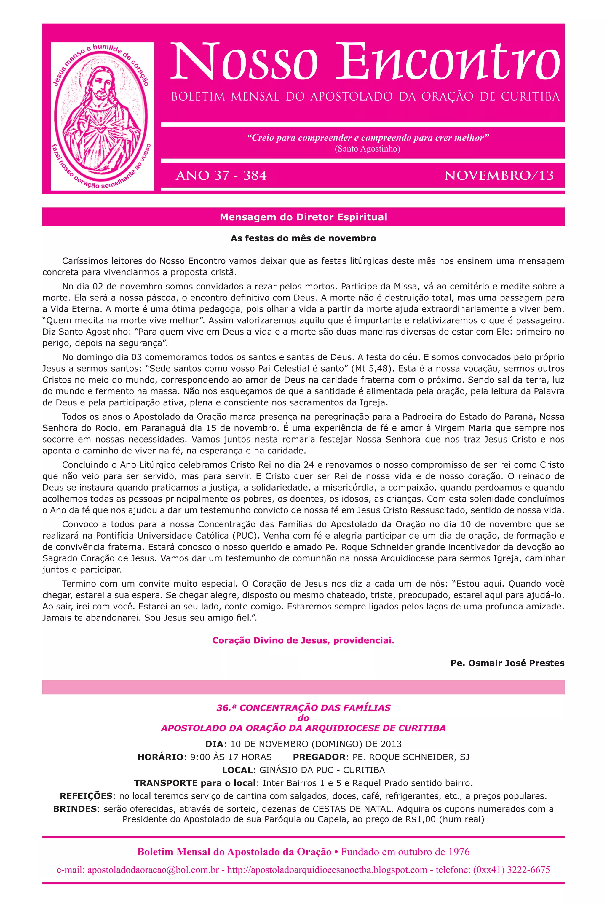 O documento fala sobre as festas litúrgicas do mês de novembro na Igreja Católica, incluindo o Dia de Finados, a Festa de Todos os Santos e a festa de Nossa Senhora do Rocio. O diretor espiritual convida os leitores a refletirem sobre a santidade e a participarem de vários eventos no mês, incluindo uma concentração das famílias do Apostolado da Oração.