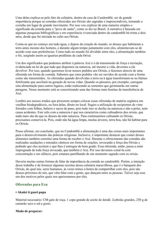 1) A culinária do Candomblé é importante para oferecer comidas sagradas aos Orixás. 2) As comidas oferecidas simbolizam as preferências alimentares dos Orixás quando habitavam a terra. 3) As oferendas de comida transmitem pedidos aos Orixás e ao serem devolvidas à natureza reciclam a energia Axé.