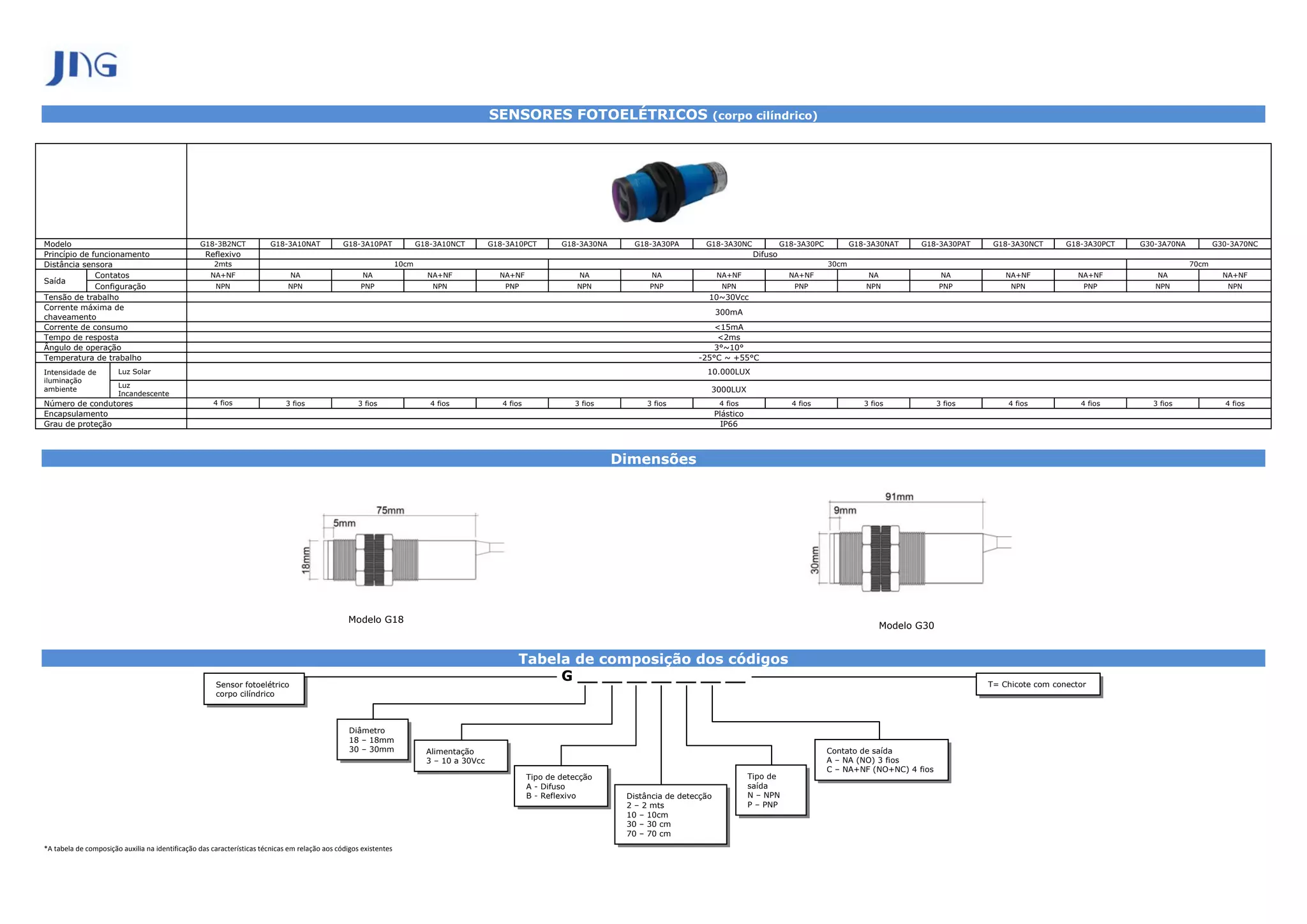 Este documento fornece especificações técnicas para vários modelos de sensores fotoelétricos cilíndricos. A tabela lista os principais parâmetros como distância de detecção, tipo de saída, tensão de alimentação, temperatura de operação e encapsulamento para cada modelo. As informações de codificação dos modelos são explicadas em uma tabela separada para facilitar a identificação das características com base nos códigos.