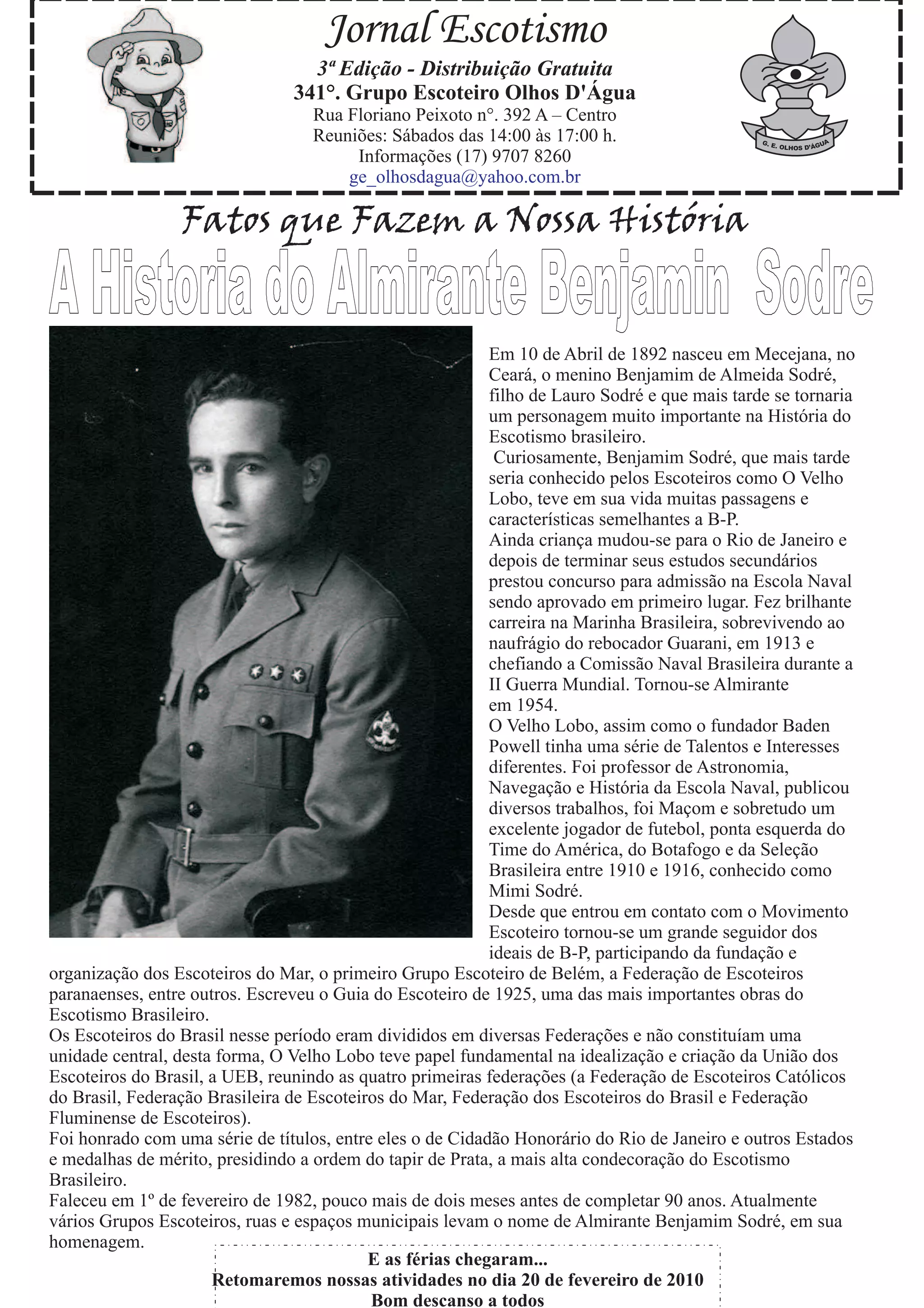 O documento apresenta informações sobre o 341o Grupo Escoteiro Olhos D'Água, incluindo seu endereço, horário de reuniões e contatos. Também descreve o significado das cores do lenço do grupo, representando alegria, observância e dedicação. Por fim, transmite uma mensagem de final de ano, refletindo sobre o progresso do ano que finda e desejando um próspero ano novo com novos desafios e descobertas.