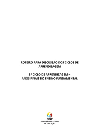 O documento discute a proposta de implementação do 3o Ciclo de Aprendizagem nos anos finais do Ensino Fundamental em 9 escolas piloto no Distrito Federal. O Ciclo de Aprendizagem visa atender diferentes níveis de aprendizagem dos estudantes através de estratégias como reagrupamento interclasse, avaliação formativa e progressão contínua.