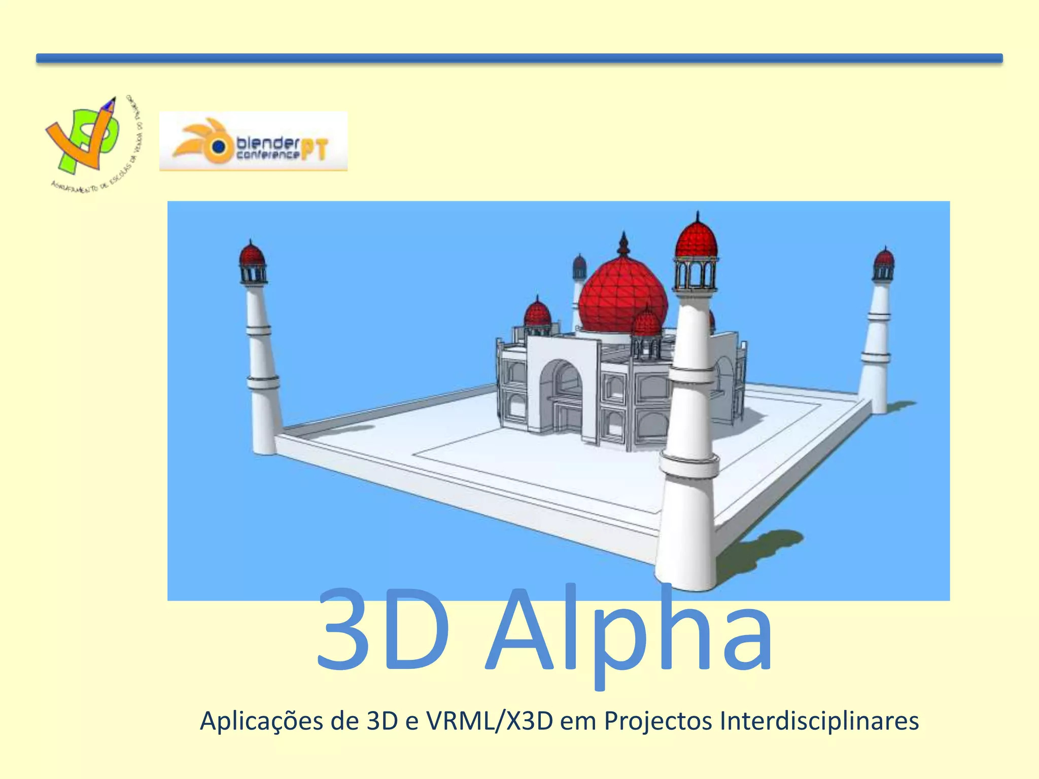 Este documento discute o projeto 3D Alpha, que visa integrar tecnologias 3D e realidade virtual em projetos interdisciplinares nas escolas. O projeto usa aplicativos como Minecraft, SketchUp e Bryce para criar mundos virtuais e objetos 3D em diferentes ciclos de ensino.