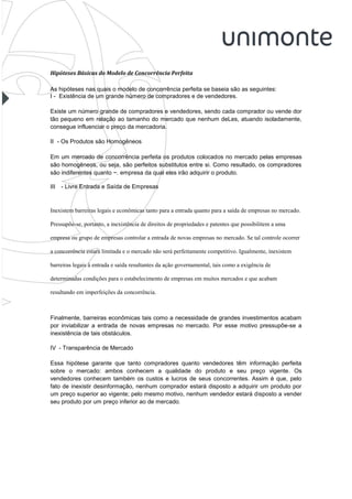 1) O documento discute as estruturas de mercado, especificamente concorrência perfeita e suas hipóteses básicas.