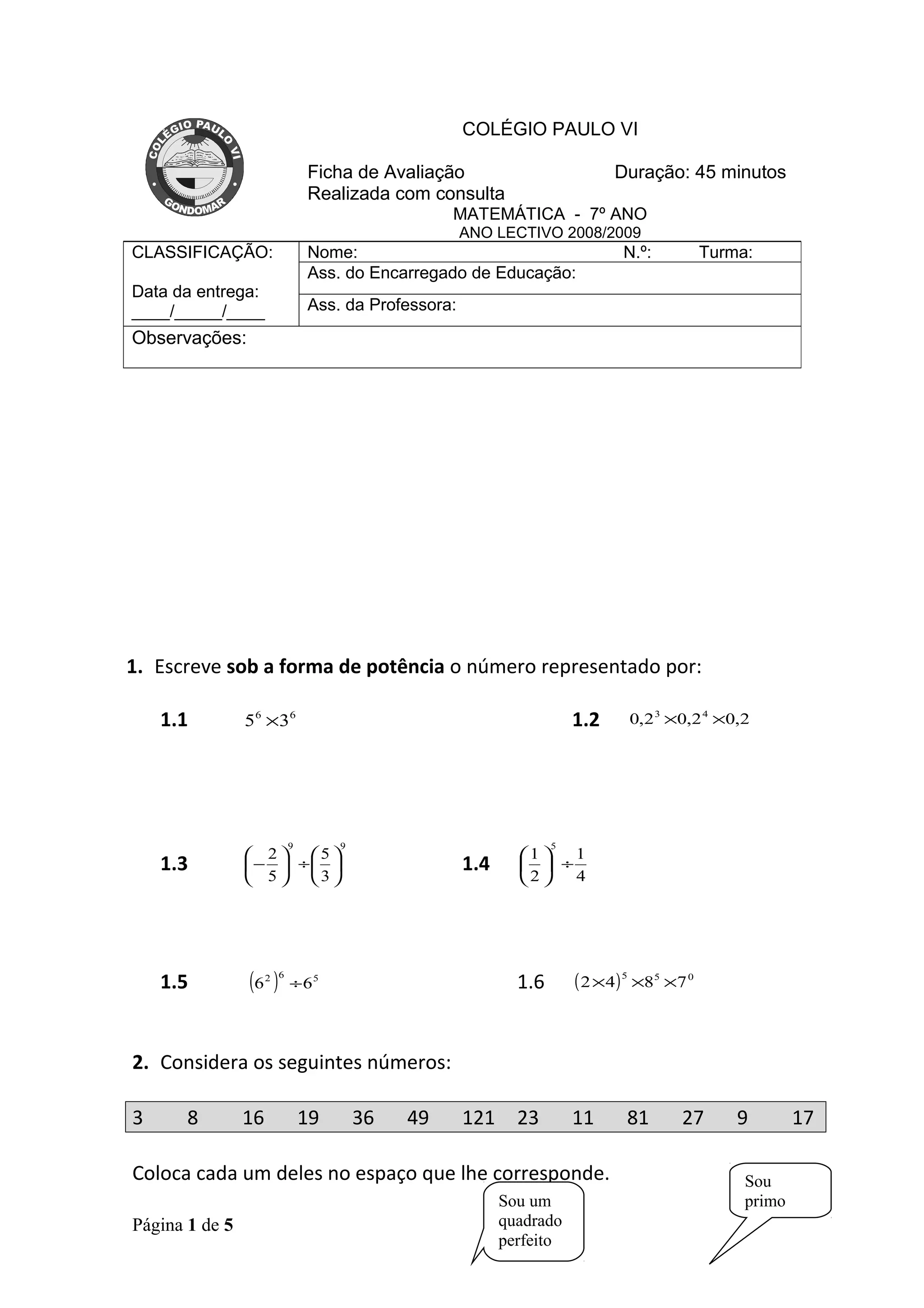 Este documento é uma ficha de avaliação de matemática para alunos do 7o ano. Contém vários exercícios sobre potências, números primos, áreas de figuras geométricas e expressões numéricas.