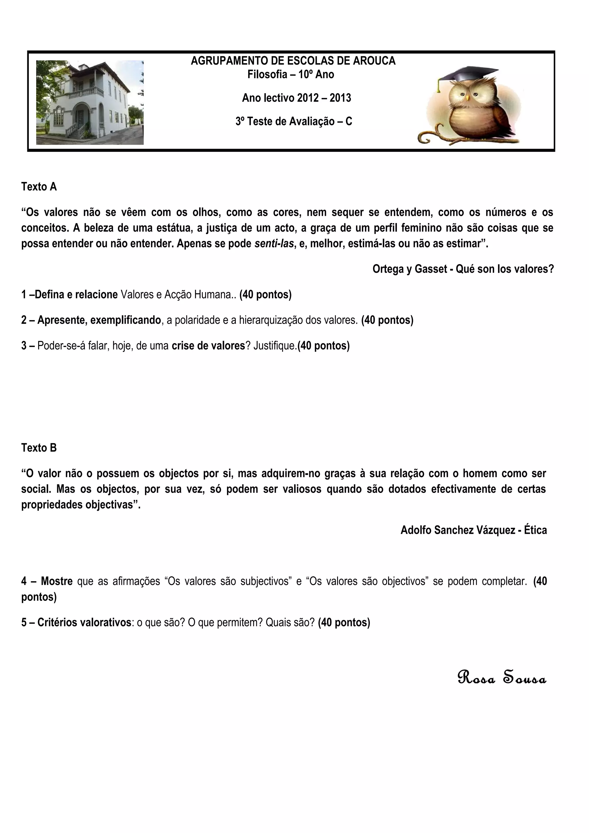 Este documento apresenta dois textos sobre valores e ética. O primeiro texto discute como valores como beleza e justiça não podem ser entendidos, mas sim sentidos. O segundo texto afirma que valores dependem da relação entre objetos e seres humanos, e objetos só podem ter valor se tiverem certas propriedades objetivas. O documento também apresenta três perguntas sobre valores e ação humana, hierarquização e polaridade de valores, e se pode falar de uma crise de valores hoje.
