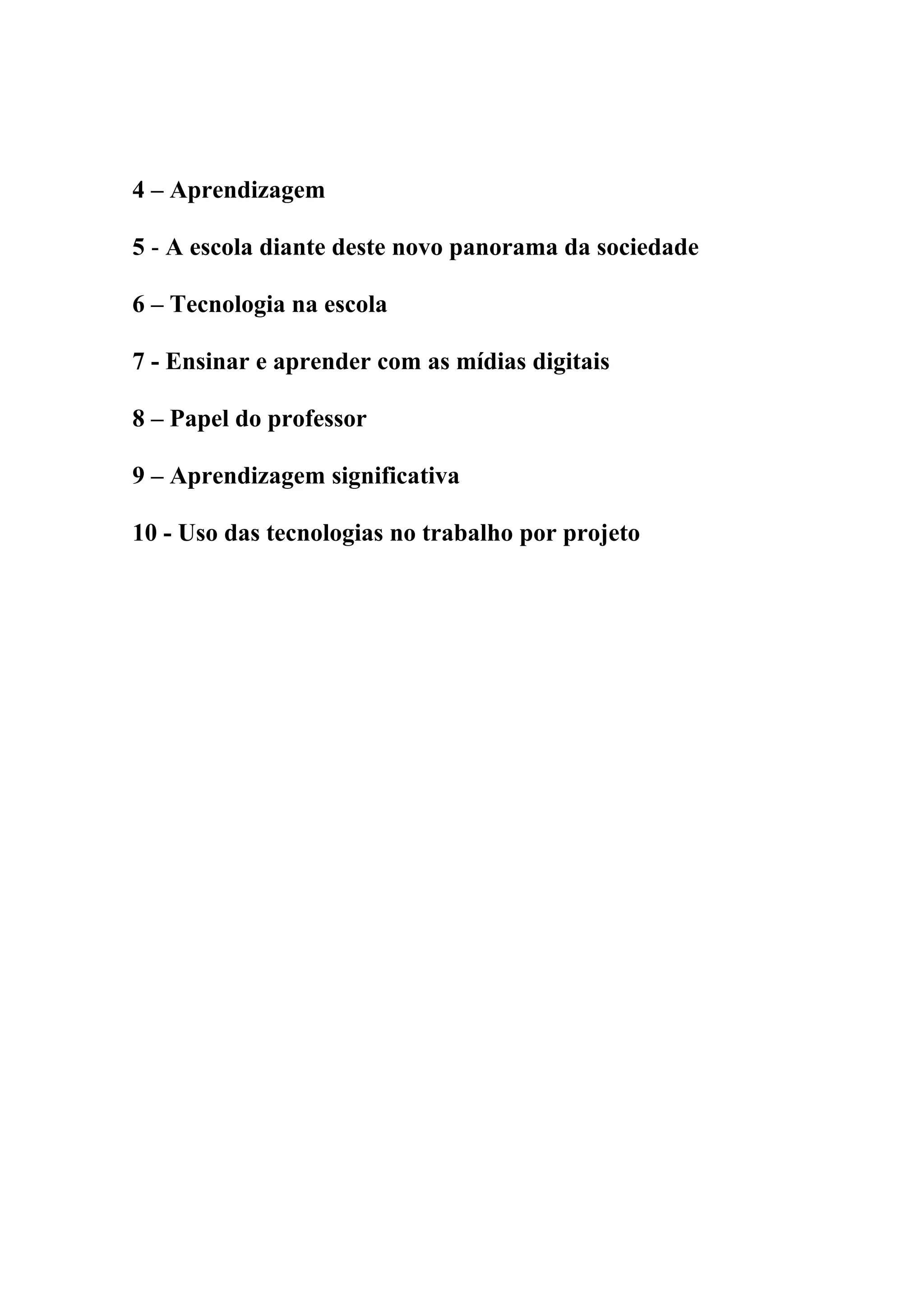 Este documento discute como a tecnologia está afetando a educação, destacando o papel das mídias digitais no ensino e aprendizagem, a importância da aprendizagem significativa e o uso de projetos que incorporam tecnologias.