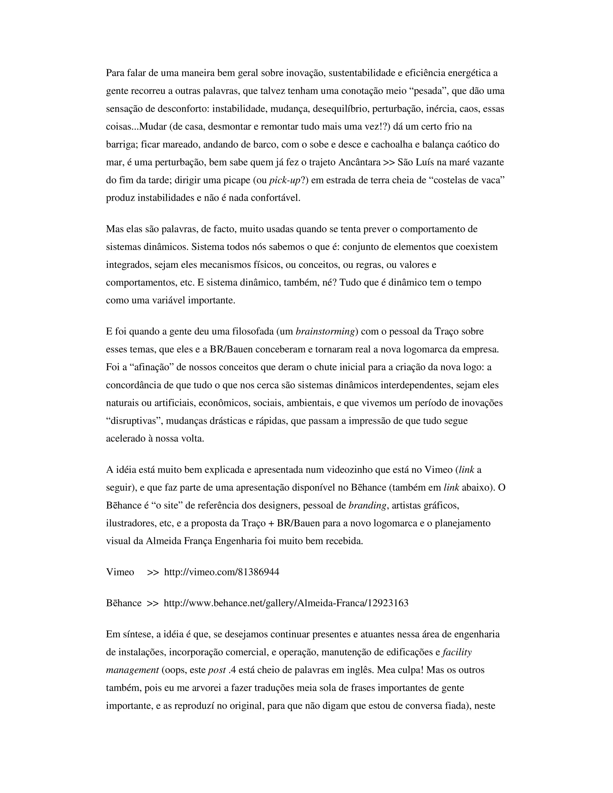 O documento discute inovação, sustentabilidade e eficiência energética em sistemas dinâmicos interdependentes naturais e artificiais. Apresenta a nova logomarca da empresa Almeida França Engenharia concebida pela Traço e BR/Bauen para representar esse conceito de mudança contínua em períodos de inovações disruptivas.