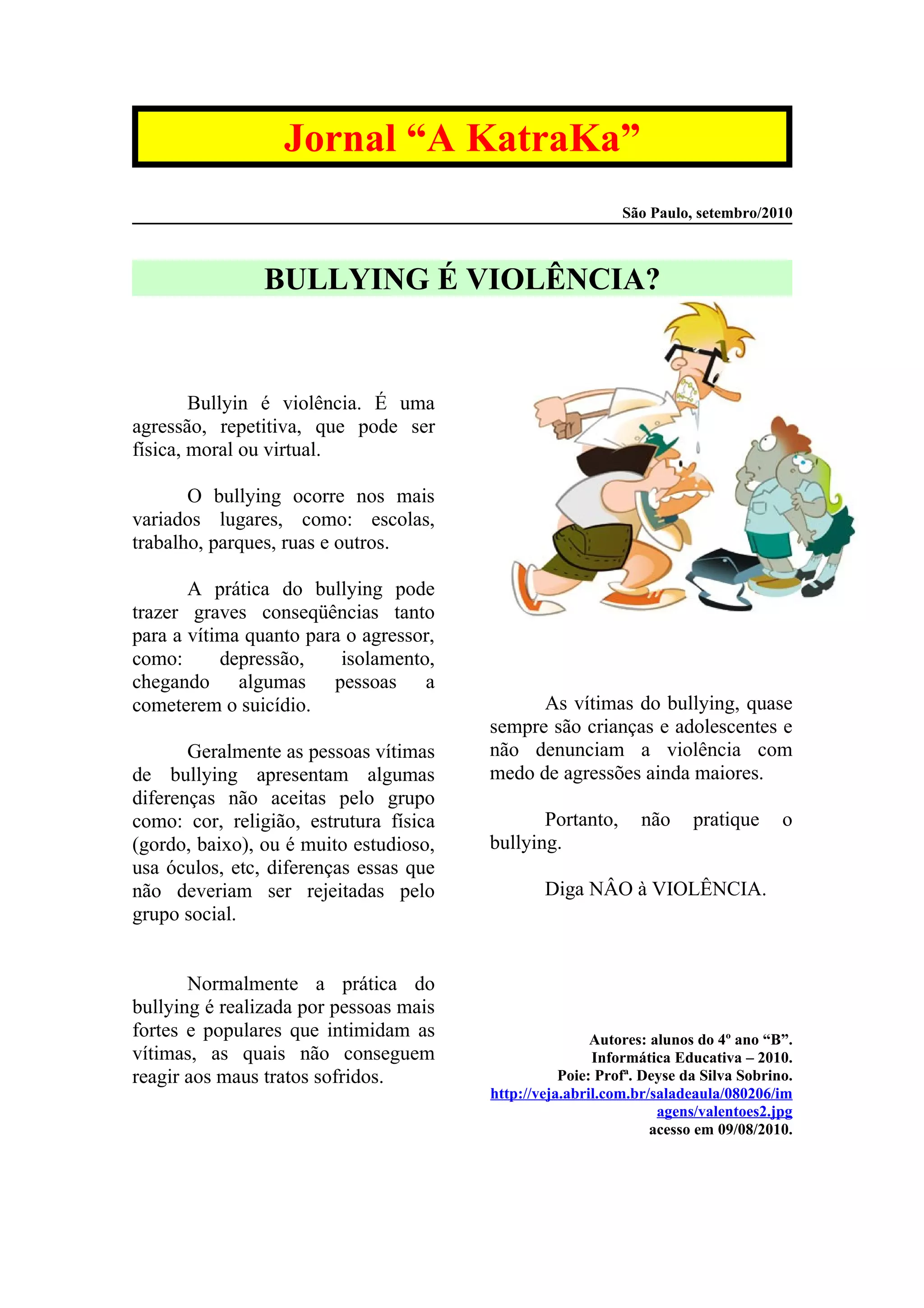 O documento discute bullying, definindo-o como uma agressão repetitiva que pode ser física, moral ou virtual. O bullying ocorre em diversos lugares e pode trazer consequências graves como depressão ou suicídio para vítimas e agressores. Geralmente as vítimas são crianças e adolescentes que apresentam diferenças não aceitas pelo grupo, como cor ou estrutura física.