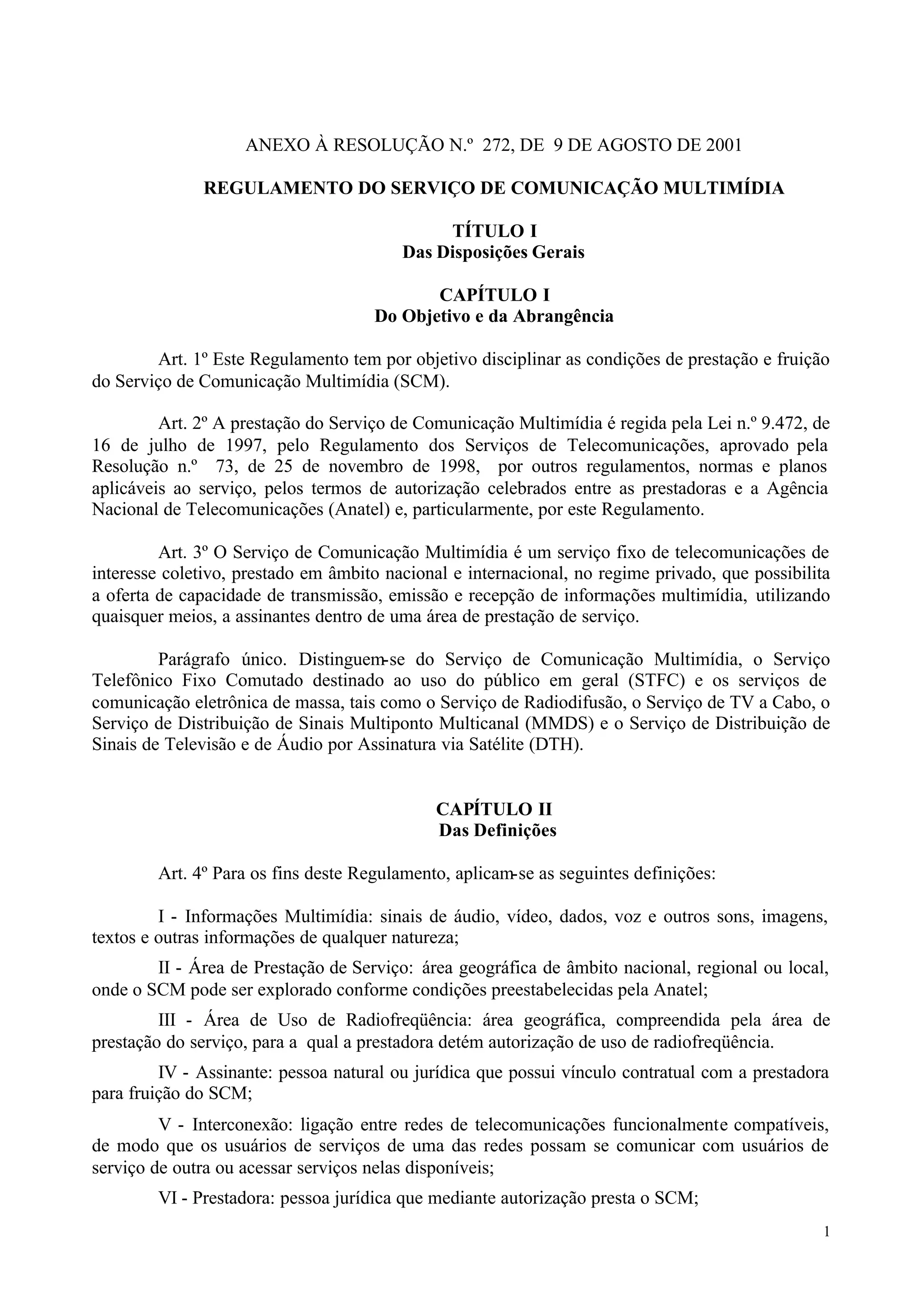 Este documento estabelece as diretrizes regulatórias para o Serviço de Comunicação Multimídia no Brasil. Ele define o SCM como um serviço de telecomunicações fixo que permite a transmissão de informações multimídia e estabelece regras para a autorização, instalação e operação das redes SCM.