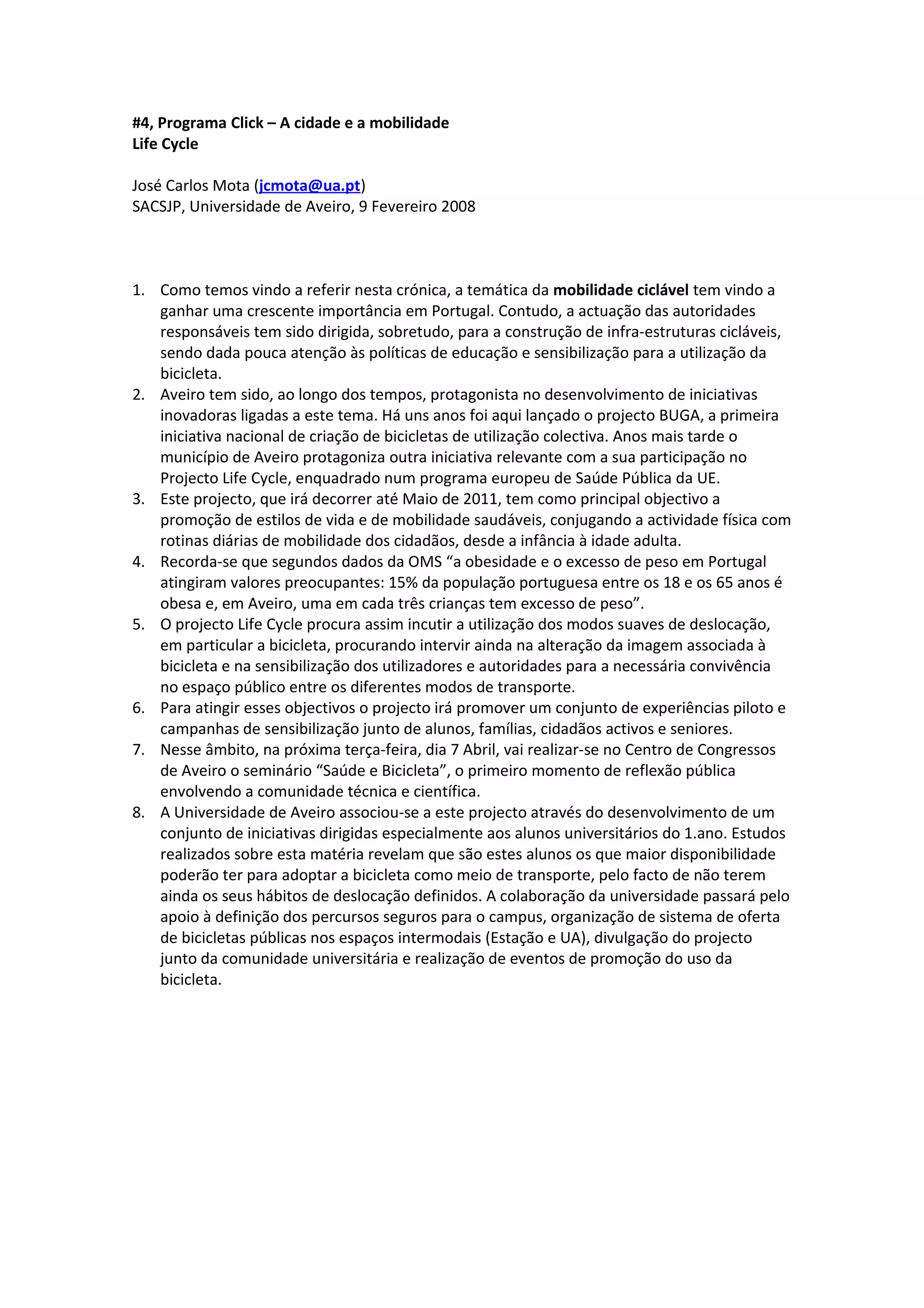 Este documento descreve o projeto Life Cycle, que tem como objetivo promover estilos de vida e mobilidade saudáveis através do uso da bicicleta. O projeto irá realizar campanhas de sensibilização junto de alunos, famílias, cidadãos e idosos e organizar seminários sobre saúde e bicicleta. A Universidade de Aveiro associou-se ao projeto para incentivar o uso da bicicleta entre os alunos do 1o ano.