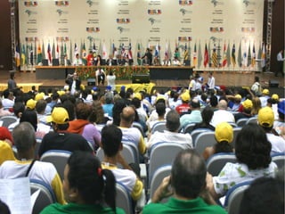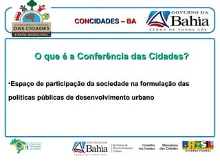 O documento descreve a 4a Conferência Estadual das Cidades da Bahia, incluindo seu objetivo de promover a participação da sociedade civil na formulação de políticas públicas de desenvolvimento urbano. Ele explica o papel e importância das conferências das cidades, seus temas de debate, e desafios atuais para as políticas urbanas.