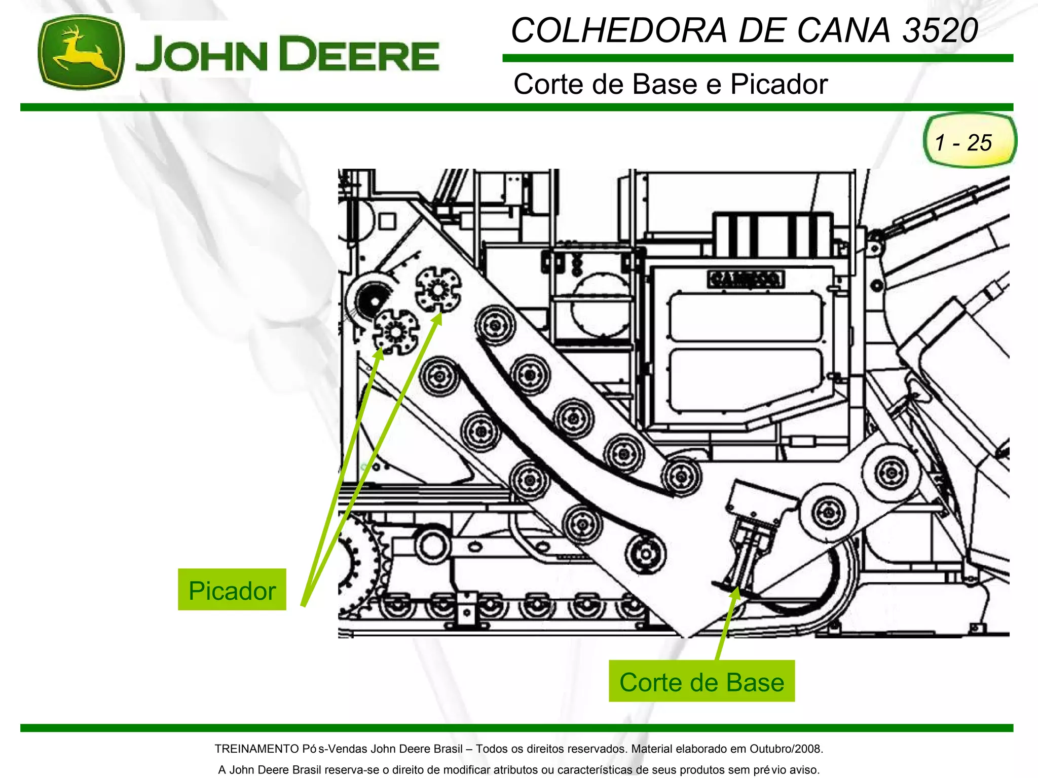 O documento descreve os componentes e procedimentos de manutenção da colhedora de cana John Deere 3520, incluindo o cortador de base e o picador. Detalha os componentes hidráulicos como as bombas e válvulas, e fornece instruções sobre ajuste de pressão e lubrificação. Também mostra imagens dos componentes e sistemas elétricos e mecânicos.