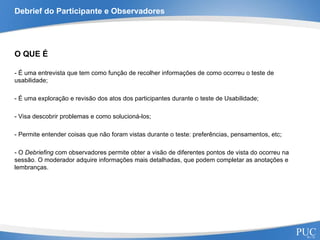 O documento aborda técnicas de debriefing de participantes e observadores em testes de usabilidade, enfatizando a importância de coletar informações qualitativas após o teste. São apresentadas recomendações para conduzir discussões abertas e não intimidantes, além de métodos para revisão e coleta de feedback dos usuários. Técnicas avançadas como 'advogado do diabo' e a inclusão de observadores são discutidas para melhorar a eficácia do processo de avaliação.