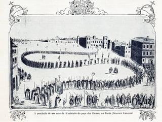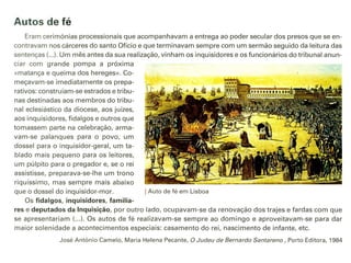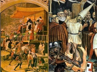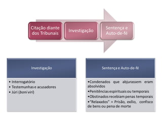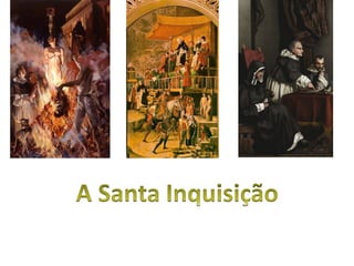 A Inquisição católica promoveu o extermínio de milhões de pessoas ao longo de quase 1000 anos através de tribunais eclesiásticos que perseguiam hereges e condenavam à morte em autos-de-fé públicos. A Inquisição em Portugal utilizava torturas como o candelabro, a roda e a pêra para obter confissões e aterrorizar a população. O poder do Estado e da Igreja se fortaleciam com a Inquisição durante o reinado de D. João V, que assist